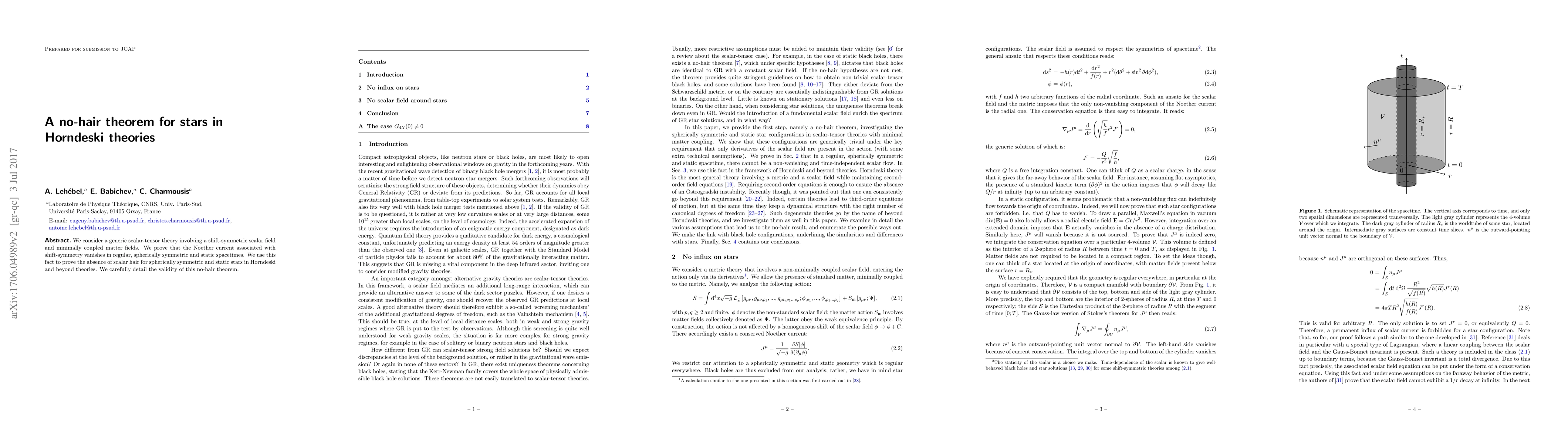 We consider a generic scalar-tensor theory involving a shift-symmetric scalar field and minimally coupled matter fields. We prove that the Noether current associated with shift-symmetry vanishes in regular, spherically symmetric and static spacetimes. We use this fact to prove the absence of scalar hair for spherically symmetric and static stars in Horndeski and beyond theories. We carefully detail the validity of this no-hair theorem.