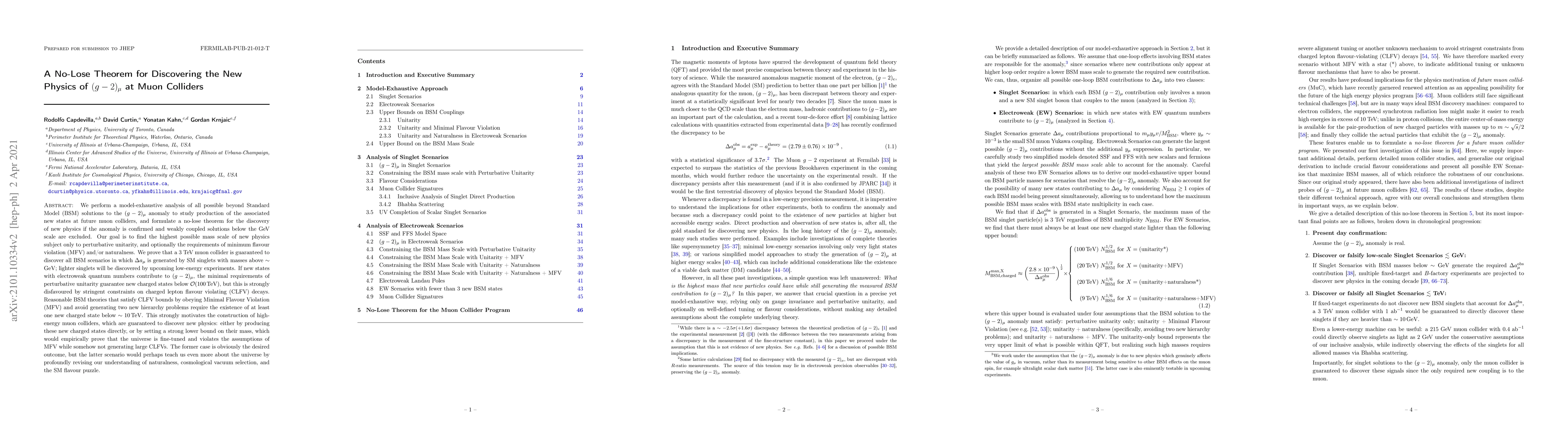 We perform a model-exhaustive analysis of all possible beyond Standard Model (BSM) solutions to the $(g-2)_\mu$ anomaly to study production of the associated new states at future muon colliders, and formulate a no-lose theorem for the discovery of new physics if the anomaly is confirmed and weakly coupled solutions below the GeV scale are excluded. Our goal is to find the highest possible mass scale of new physics subject only to perturbative unitarity, and optionally the requirements of minimum flavour violation (MFV) and/or naturalness. We prove that a 3 TeV muon collider is guaranteed to discover all BSM scenarios in which $\Delta a_\mu$ is generated by SM singlets with masses above $\sim $ GeV; lighter singlets will be discovered by upcoming low-energy experiments. If new states with electroweak quantum numbers contribute to $(g-2)_\mu$, the minimal requirements of perturbative unitarity guarantee new charged states below $\mathcal{O}(100 {\rm TeV})$, but this is strongly disfavoured by stringent constraints on charged lepton flavour violating (CLFV) decays. Reasonable BSM theories that satisfy CLFV bounds by obeying Minimal Flavour Violation (MFV) and avoid generating two new hierarchy problems require the existence of at least one new charged state below $\sim 10$ TeV. This strongly motivates the construction of high-energy muon colliders, which are guaranteed to discover new physics: either by producing these new charged states directly, or by setting a strong lower bound on their mass, which would empirically prove that the universe is fine-tuned and violates the assumptions of MFV while somehow not generating large CLFVs. The former case is obviously the desired outcome, but the latter scenario would perhaps teach us even more about the universe by profoundly revising our understanding of naturalness, cosmological vacuum selection, and the SM flavour puzzle.