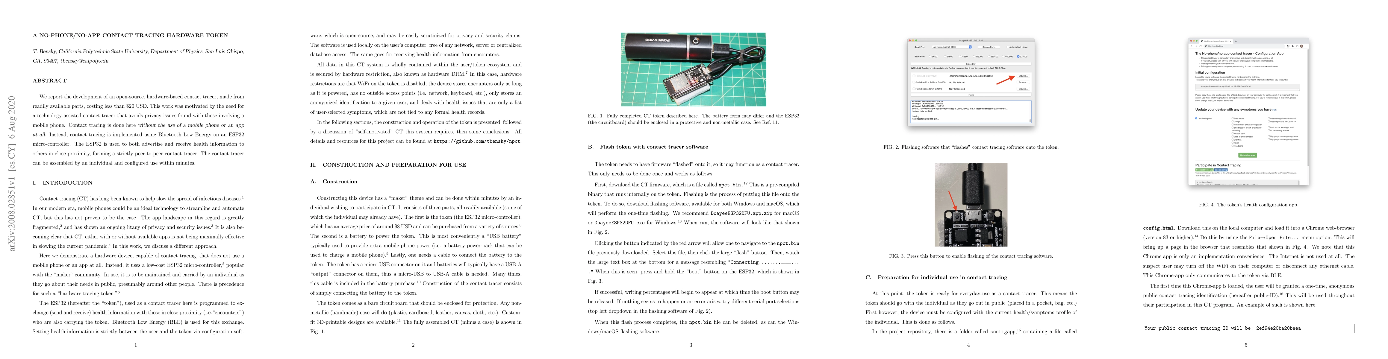 We report the development of an open-source, hardware-based contact tracer, made from readily available parts, costing less than $20USD. This work was motivated by the need for a technology-assisted contact tracer that avoids privacy issues found with those involving a mobile phone. Contact tracing is done here without the use of a mobile phone or an app at all. Instead, contact tracing is implemented using Bluetooth Low Energy on an ESP32 micro-controller. The ESP32 is used to both advertise and receive health information to others in close proximity, forming a strictly peer-to-peer contact tracer. The contact tracer can be assembled by an individual and configured use within minutes.