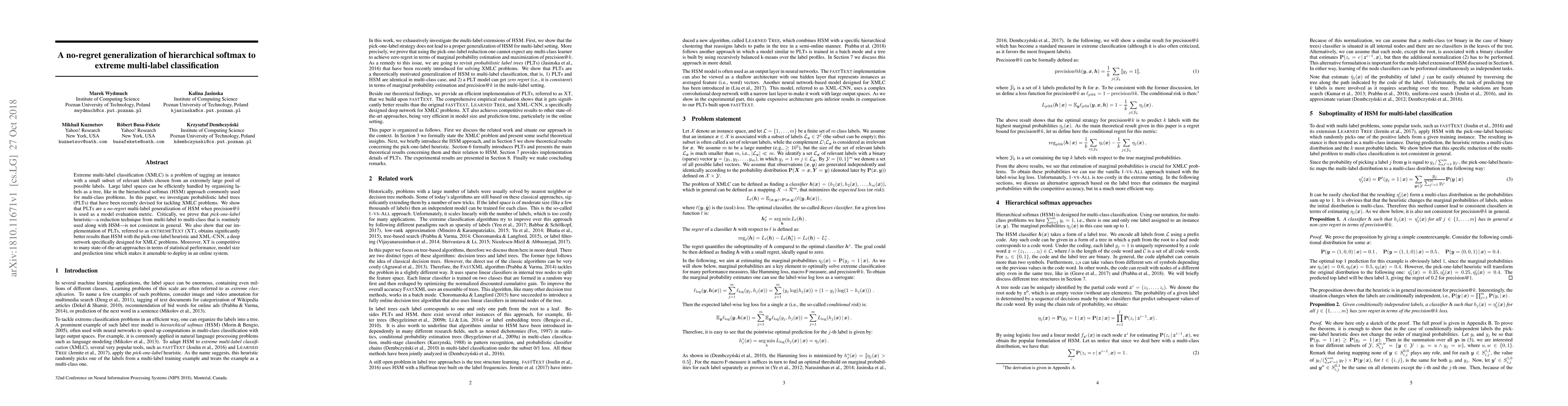 This paper proposes a probabilistic label tree (PLT) approach, termed extremeText (XT), for tackling extreme multi-label classification (XMLC). The authors demonstrate that PLTs outperform hierarchical softmax (HSM) and XML-CNN, achieving better precision@k results while being competitive in terms of model size and prediction speed.