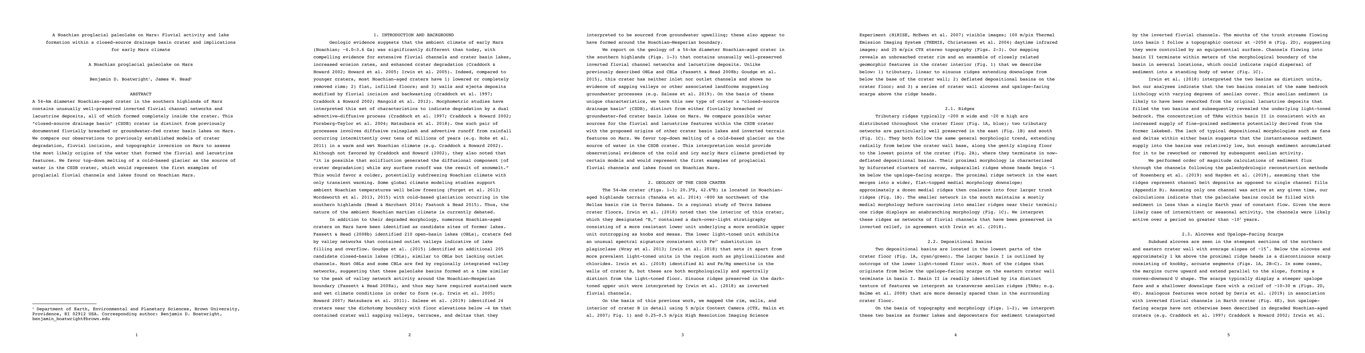 This paper investigates a 54-km Noachian-aged crater on Mars with well-preserved inverted fluvial channels and lacustrine deposits, suggesting the presence of a proglacial paleolake. The study favors top-down melting of a cold-based glacier as the source of water, indicating early Mars had a more complex climate than previously thought.