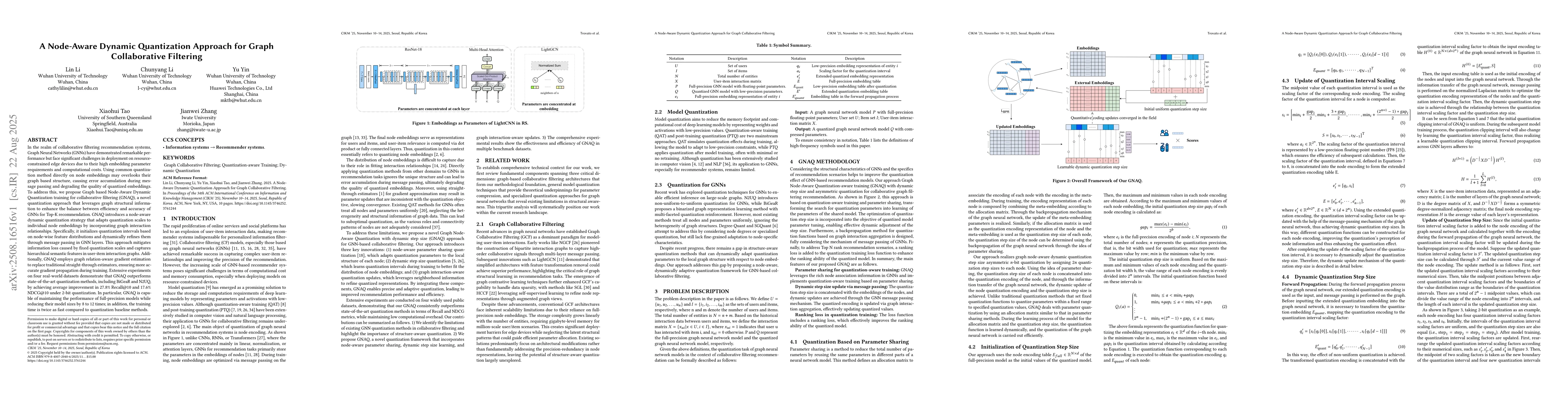 In the realm of collaborative filtering recommendation systems, Graph Neural Networks (GNNs) have demonstrated remarkable performance but face significant challenges in deployment on resource-constrained edge devices due to their high embedding parameter requirements and computational costs. Using common quantization method directly on node embeddings may overlooks their graph based structure, causing error accumulation during message passing and degrading the quality of quantized embeddings.To address this, we propose Graph based Node-Aware Dynamic Quantization training for collaborative filtering (GNAQ), a novel quantization approach that leverages graph structural information to enhance the balance between efficiency and accuracy of GNNs for Top-K recommendation. GNAQ introduces a node-aware dynamic quantization strategy that adapts quantization scales to individual node embeddings by incorporating graph interaction relationships. Specifically, it initializes quantization intervals based on node-wise feature distributions and dynamically refines them through message passing in GNN layers. This approach mitigates information loss caused by fixed quantization scales and captures hierarchical semantic features in user-item interaction graphs. Additionally, GNAQ employs graph relation-aware gradient estimation to replace traditional straight-through estimators, ensuring more accurate gradient propagation during training. Extensive experiments on four real-world datasets demonstrate that GNAQ outperforms state-of-the-art quantization methods, including BiGeaR and N2UQ, by achieving average improvement in 27.8\% Recall@10 and 17.6\% NDCG@10 under 2-bit quantization. In particular, GNAQ is capable of maintaining the performance of full-precision models while reducing their model sizes by 8 to 12 times; in addition, the training time is twice as fast compared to quantization baseline methods.