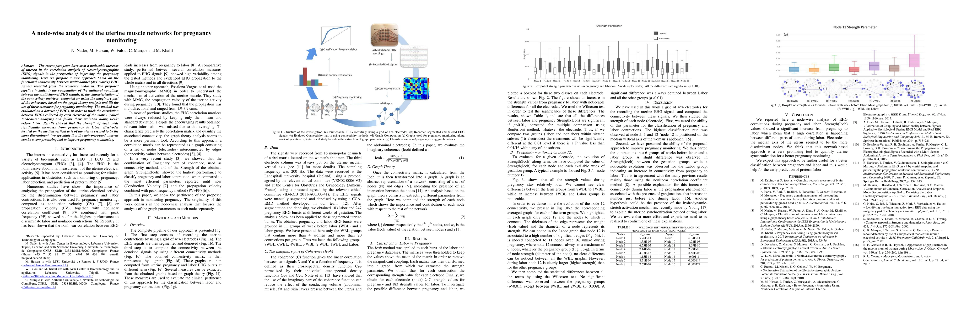 The recent past years have seen a noticeable increase of interest in the correlation analysis of electrohysterographic (EHG) signals in the perspective of improving the pregnancy monitoring. Here we propose a new approach based on the functional connectivity between multichannel (4x4 matrix) EHG signals recorded from the women abdomen. The proposed pipeline includes i) the computation of the statistical couplings between the multichannel EHG signals, ii) the characterization of the connectivity matrices, computed by using the imaginary part of the coherence, based on the graph-theory analysis and iii) the use of these measures for pregnancy monitoring. The method was evaluated on a dataset of EHGs, in order to track the correlation between EHGs collected by each electrode of the matrix (called node-wise analysis) and follow their evolution along weeks before labor. Results showed that the strength of each node significantly increases from pregnancy to labor. Electrodes located on the median vertical axis of the uterus seemed to be the more discriminant. We speculate that the network-based analysis can be a very promising tool to improve pregnancy monitoring.