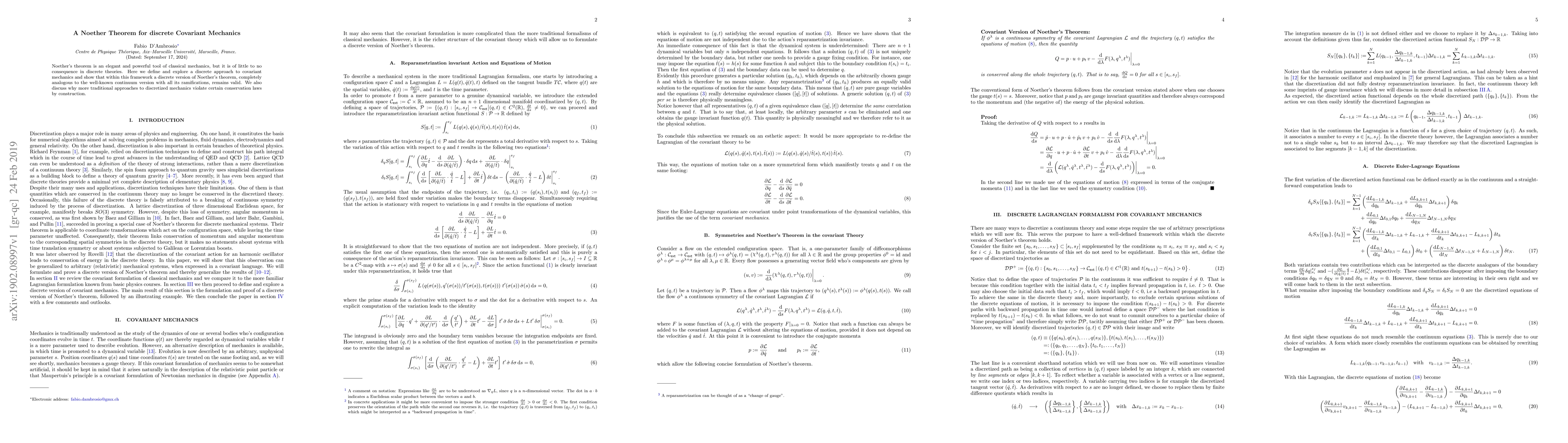 This paper introduces a discrete version of Noether's theorem within a new framework for discrete covariant mechanics, demonstrating its validity and highlighting how traditional discretization methods inherently break certain conservation laws.
