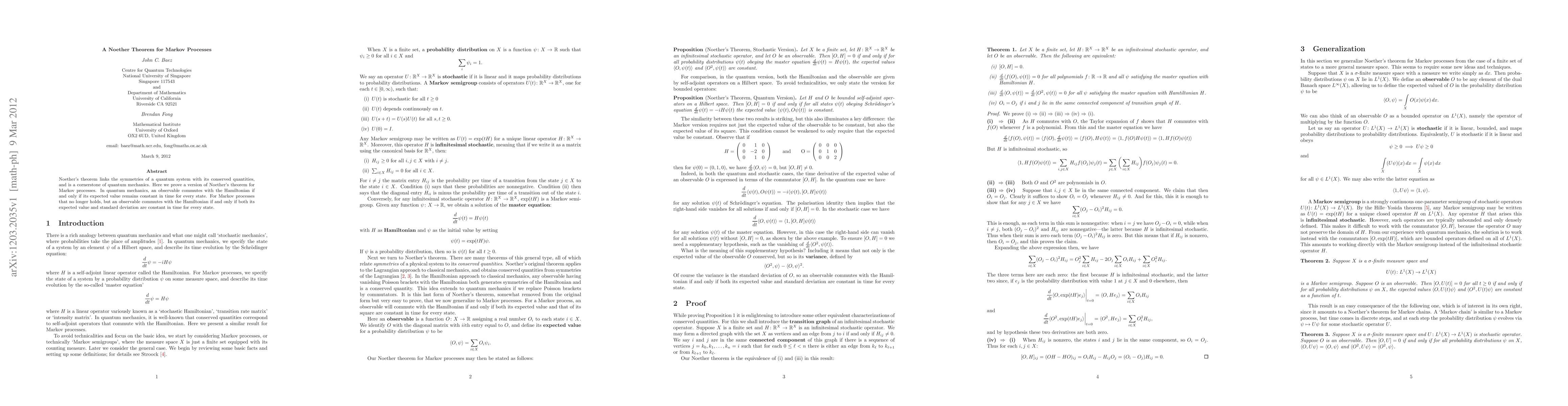 This paper proves a version of Noether's theorem for Markov processes, establishing that an observable commutes with the Hamiltonian if and only if both its expected value and standard deviation remain constant over time for every state, extending the classical theorem's principles to stochastic systems.