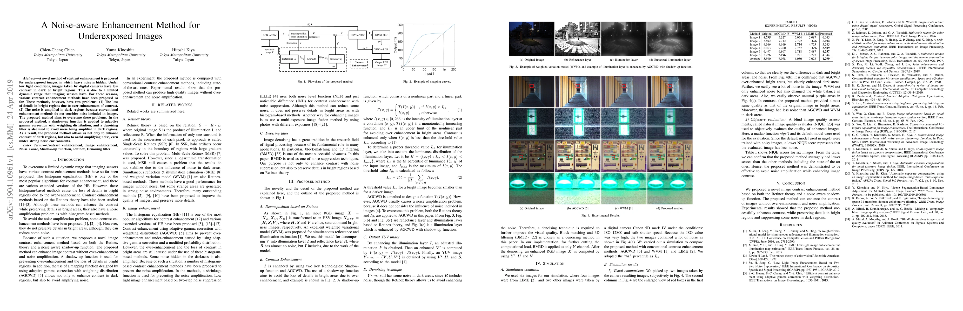 A novel method of contrast enhancement is proposed for underexposed images, in which heavy noise is hidden. Under low light conditions, images taken by digital cameras have low contrast in dark or bright regions. This is due to a limited dynamic range that imaging sensors have. For these reasons, various contrast enhancement methods have been proposed so far. These methods, however, have two problems: (1) The loss of details in bright regions due to over-enhancement of contrast. (2) The noise is amplified in dark regions because conventional enhancement methods do not consider noise included in images. The proposed method aims to overcome these problems. In the proposed method, a shadow-up function is applied to adaptive gamma correction with weighting distribution, and a denoising filter is also used to avoid noise being amplified in dark regions. As a result, the proposed method allows us not only to enhance contrast of dark regions, but also to avoid amplifying noise, even under strong noise environments.