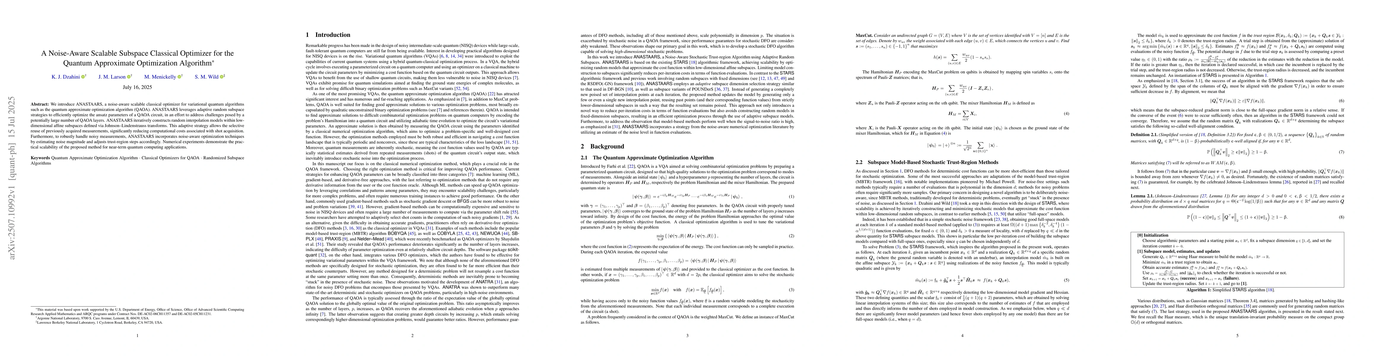 We introduce ANASTAARS, a noise-aware scalable classical optimizer for variational quantum algorithms such as the quantum approximate optimization algorithm (QAOA). ANASTAARS leverages adaptive random subspace strategies to efficiently optimize the ansatz parameters of a QAOA circuit, in an effort to address challenges posed by a potentially large number of QAOA layers. ANASTAARS iteratively constructs random interpolation models within low-dimensional affine subspaces defined via Johnson--Lindenstrauss transforms. This adaptive strategy allows the selective reuse of previously acquired measurements, significantly reducing computational costs associated with shot acquisition. Furthermore, to robustly handle noisy measurements, ANASTAARS incorporates noise-aware optimization techniques by estimating noise magnitude and adjusts trust-region steps accordingly. Numerical experiments demonstrate the practical scalability of the proposed method for near-term quantum computing applications.
