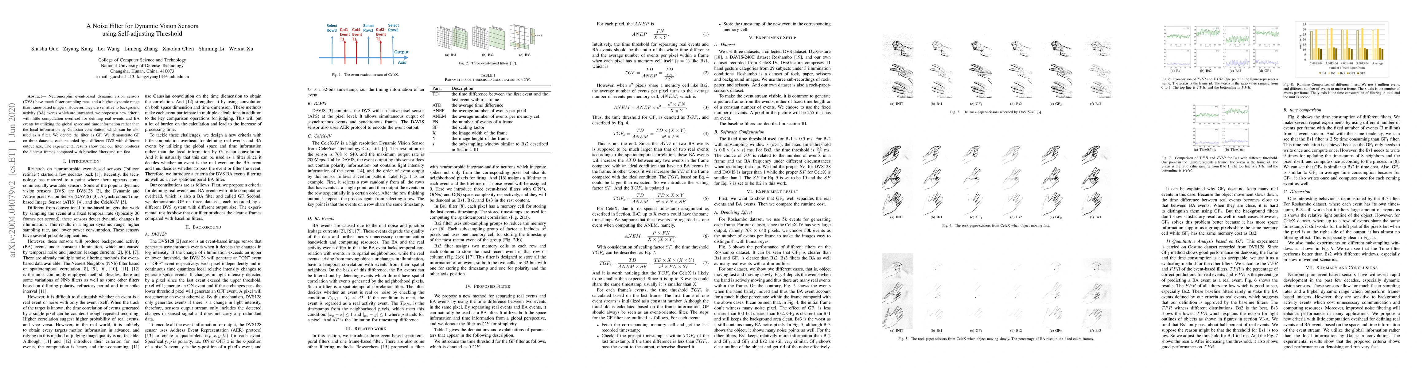 This paper proposes a self-adjusting threshold noise filter (GF) for dynamic vision sensors (DVS) to distinguish real events from background activity with minimal computational overhead. Experimental results show that GF produces clearer frames and is faster than baseline filters across three datasets.