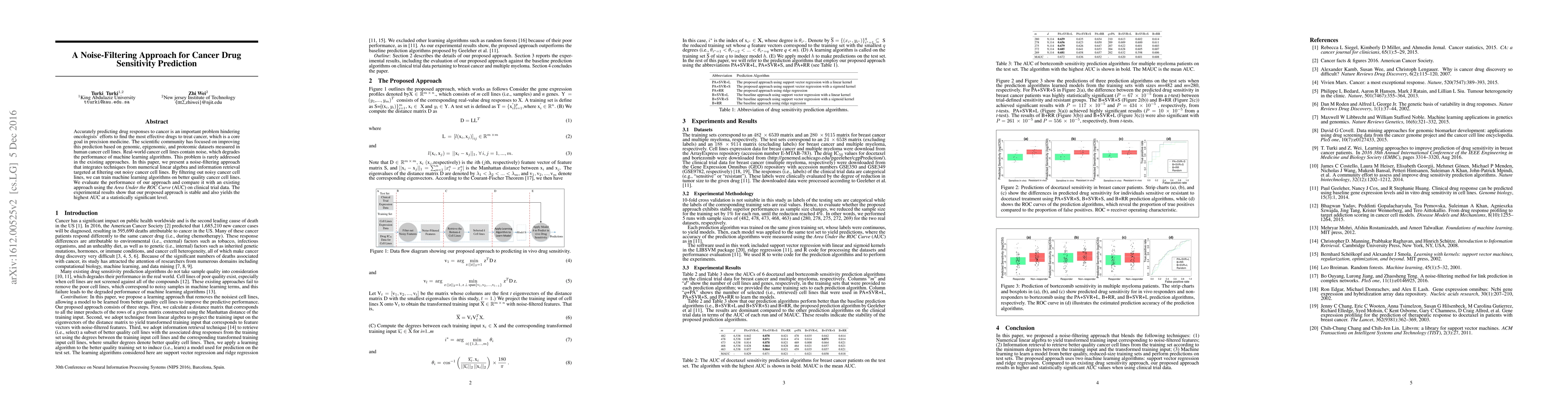 This paper introduces a noise-filtering approach to improve the prediction of cancer drug sensitivity by removing noisy cancer cell lines using techniques from numerical linear algebra and information retrieval. Experimental results show that this method outperforms existing approaches, achieving a statistically significant higher Area Under the ROC Curve (AUC).