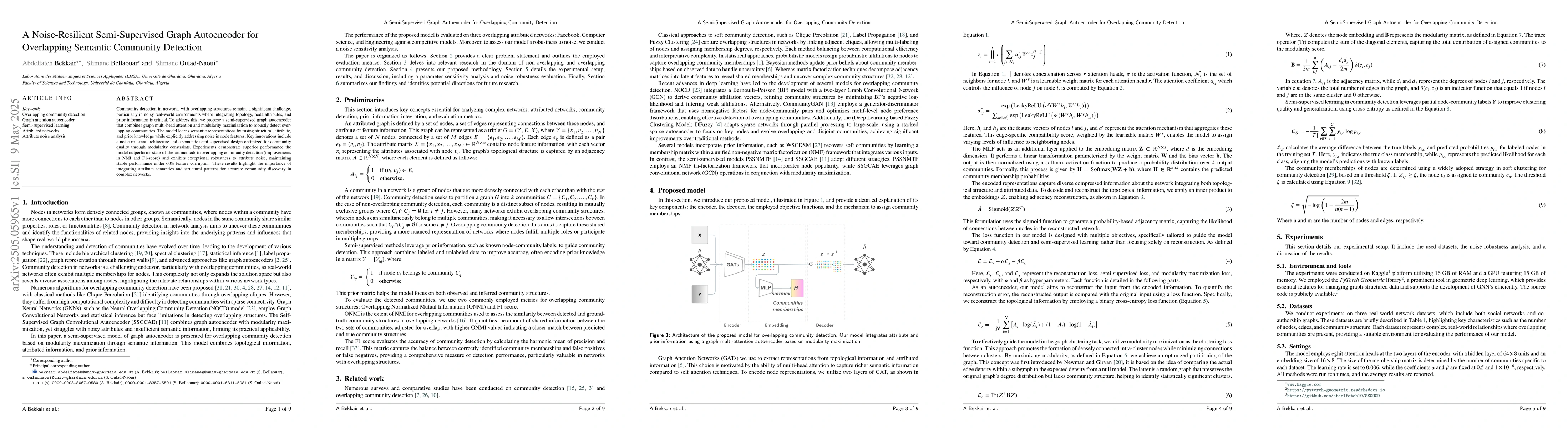 This research paper proposes a semi-supervised graph autoencoder for detecting overlapping communities in networks with noise, achieving superior performance over state-of-the-art methods and robustness to attribute noise.