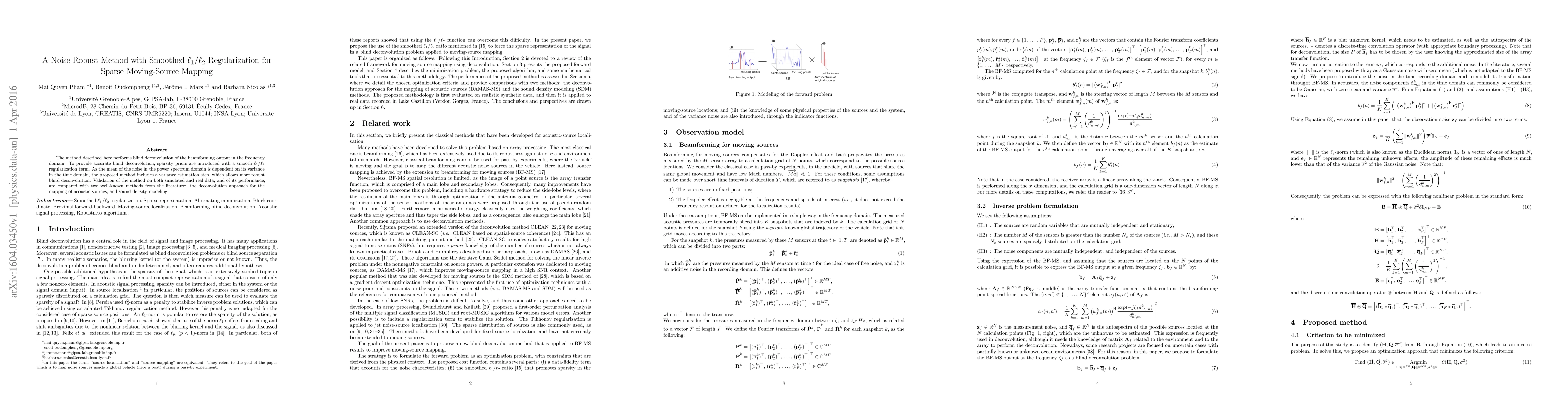 The method described here performs blind deconvolution of the beamforming output in the frequency domain. To provide accurate blind deconvolution, sparsity priors are introduced with a smooth \ell_1/\ell_2 regularization term. As the mean of the noise in the power spectrum domain is dependent on its variance in the time domain, the proposed method includes a variance estimation step, which allows more robust blind deconvolution. Validation of the method on both simulated and real data, and of its performance, are compared with two well-known methods from the literature: the deconvolution approach for the mapping of acoustic sources, and sound density modeling.