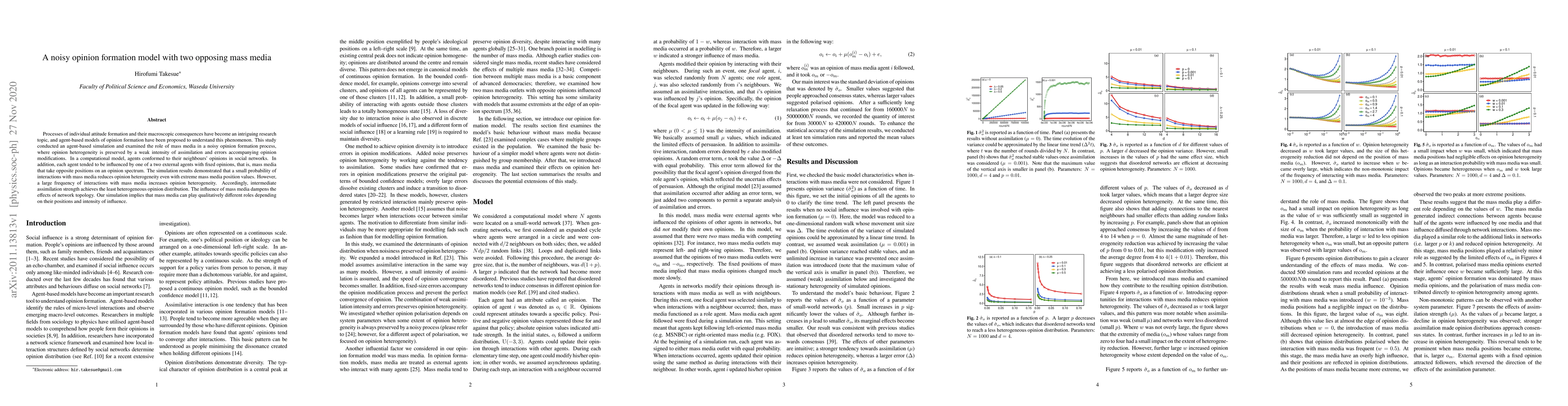 Processes of individual attitude formation and their macroscopic consequences have become an intriguing research topic, and agent-based models of opinion formation have been proposed to understand this phenomenon. This study conducted an agent-based simulation and examined the role of mass media in a noisy opinion formation process, where opinion heterogeneity is preserved by a weak intensity of assimilation and errors accompanying opinion modifications. In a computational model, agents conformed to their neighbours' opinions in social networks. In addition, each agent tended to be influenced by one of a two external agents with fixed opinions, that is, mass media that take opposite positions on an opinion spectrum. The simulation results demonstrated that a small probability of interactions with mass media reduces opinion heterogeneity even with extreme mass media position values. However, a large frequency of interactions with mass media increases opinion heterogeneity. Accordingly, intermediate assimilation strength achieves the least heterogeneous opinion distribution. The influence of mass media dampens the effects of network topology. Our simulation implies that mass media can play qualitatively different roles depending on their positions and intensity of influence.