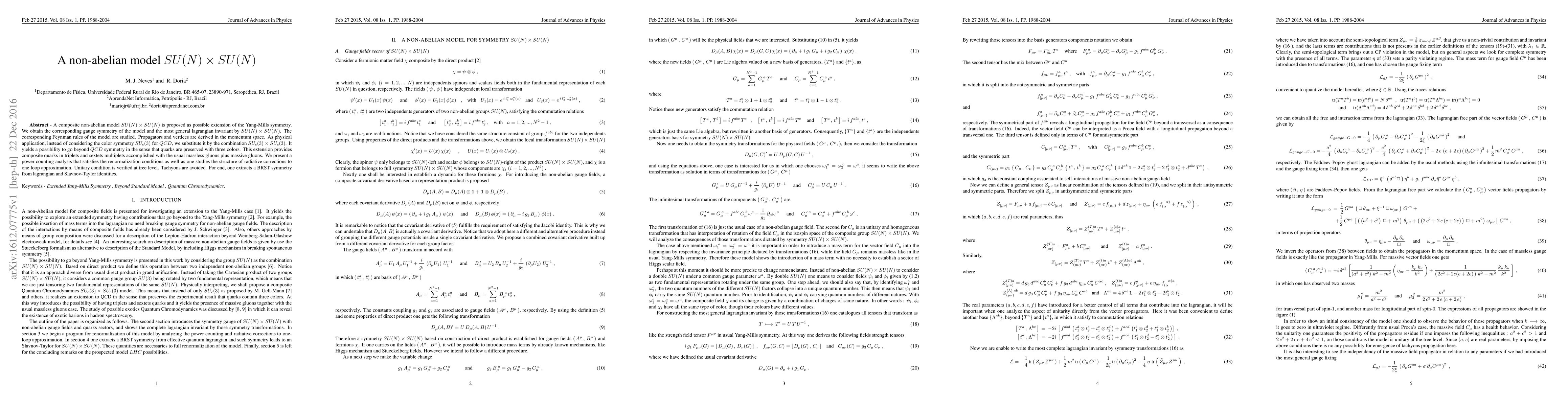 A composite non-abelian model $SU(N) \times SU(N)$ is proposed as possible extension of the Yang-Mills symmetry. We obtain the corresponding gauge symmetry of the model and the most general lagrangian invariant by $SU(N) \times SU(N)$. The corresponding Feynman rules of the model are studied. Propagators and vertices are derived in the momentum space. As physical application, instead of considering the color symmetry $SU_{c}(3)$ for $QCD$ , we substitute it by the combination $SU_{c}(3) \times SU_{c}(3)$. It yields a possibility to go beyond $QCD$ symmetry in the sense that quarks are preserved with three colors. This extension provides composite quarks in triplets and sextets multiplets accomplished with the usual massless gluons plus massive gluons. We present a power counting analysis that satisfies the renormalization conditions as well as one studies the structure of radiative corrections to one loop approximation. Unitary condition is verified at tree level. Tachyons are avoided. For end, one extracts a BRST symmetry from lagrangian and Slavnov-Taylor identities.