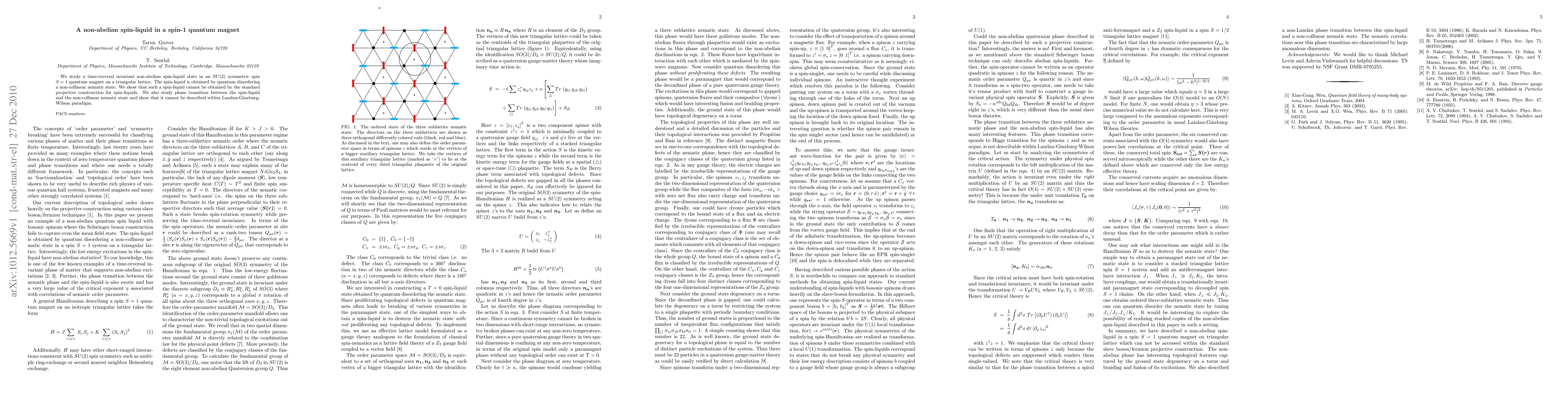 This study reveals a time-reversal invariant non-abelian spin-liquid state in a spin-1 quantum magnet on a triangular lattice, which differs from standard projective constructions. The transition from this spin-liquid to a non-collinear nematic state cannot be described by the Landau-Ginzburg-Wilson framework.