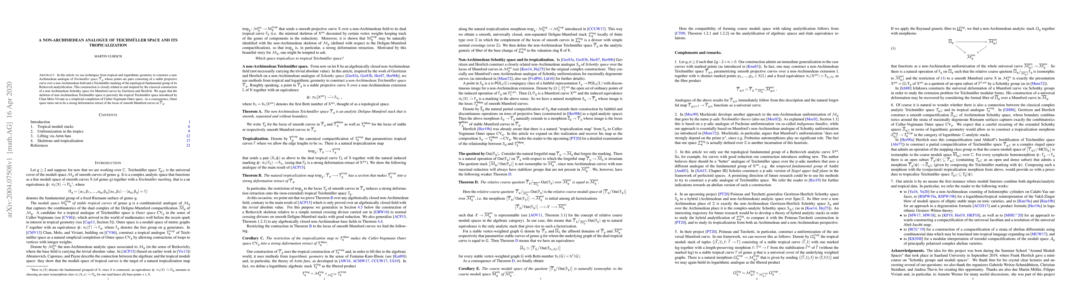 This paper constructs a non-Archimedean analogue of Teichmüller space using tropical and logarithmic geometry, relating it to the classical Schottky space. The non-Archimedean Teichmüller space's skeleton is identified with the tropical Teichmüller space, implying that Outer space is a deformation retract of smooth Mumford curves.