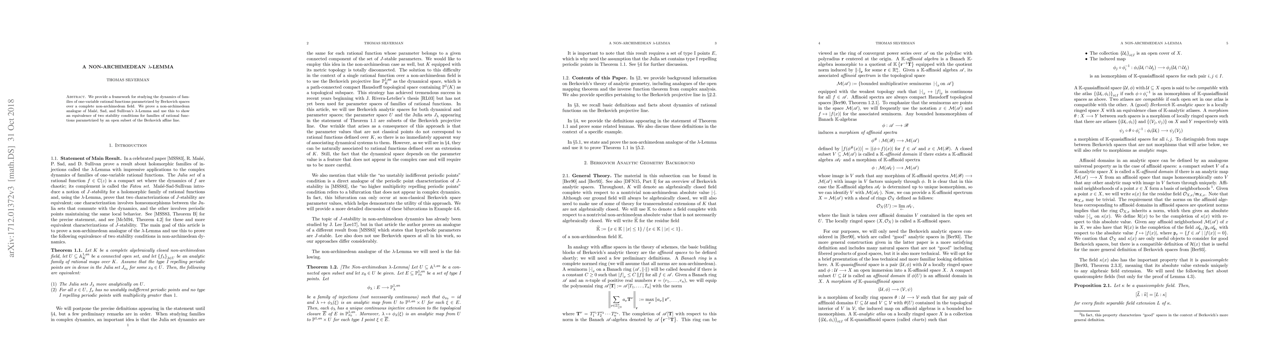 This paper establishes a non-archimedean analogue of the $\lambda$-Lemma and applies it to demonstrate an equivalence of stability conditions for families of rational functions over Berkovich spaces, enhancing the understanding of their dynamics.