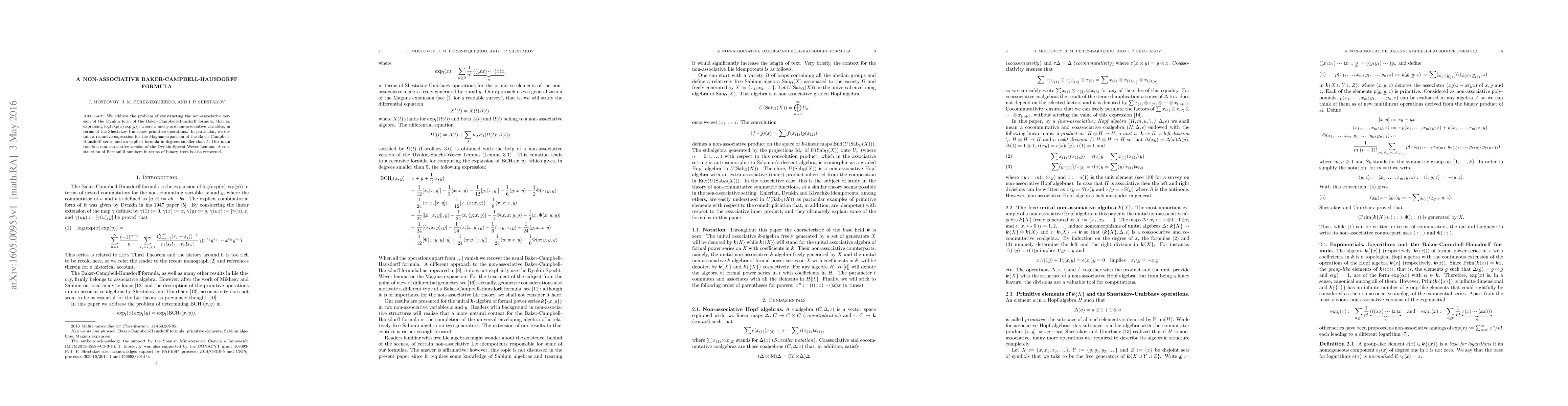 This paper develops a non-associative version of the Baker-Campbell-Hausdorff formula, providing a recursive expression for the Magnus expansion and an explicit formula up to degree 4. It leverages a non-associative Dynkin-Specht-Wever Lemma and recovers a construction of Bernoulli numbers using binary trees.