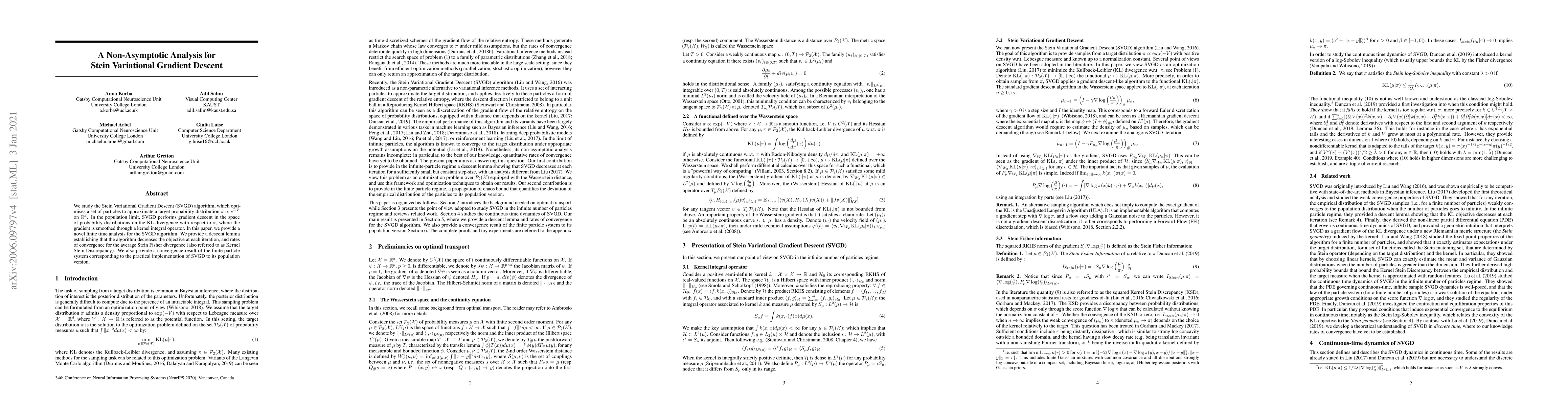 This paper presents a non-asymptotic analysis of the Stein Variational Gradient Descent (SVGD) algorithm, establishing a descent lemma and convergence rates for the average Stein Fisher divergence. It also proves the convergence of the finite particle system used in practical SVGD implementations to its population version.