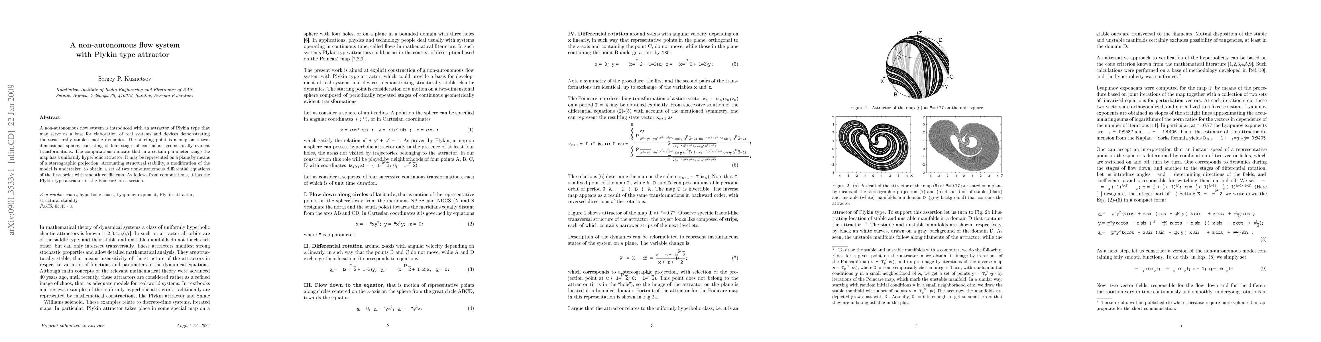 This paper introduces a non-autonomous flow system with a Plykin type attractor, demonstrating structurally stable chaotic dynamics. The system is derived from a map on a two-dimensional sphere and can be represented on a plane via stereographic projection, showing a uniformly hyperbolic attractor in a specific parameter range.