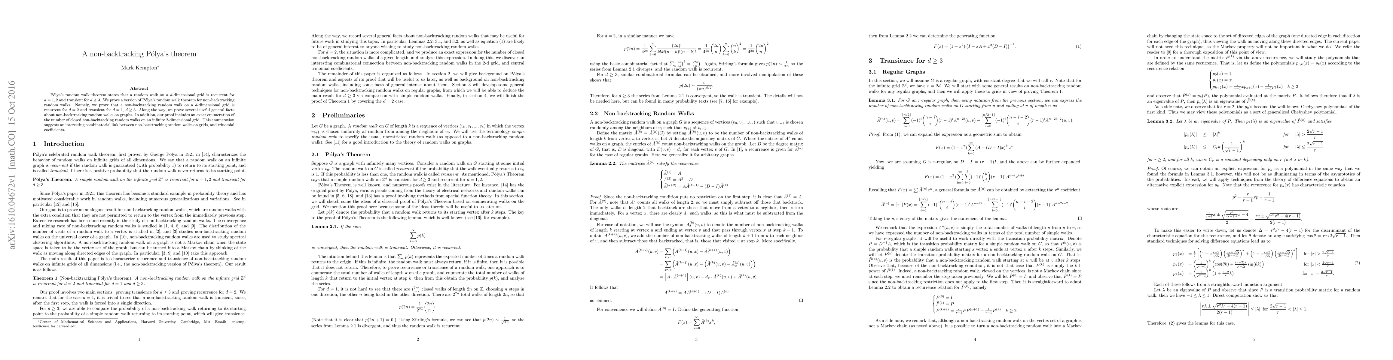 This paper proves a non-backtracking version of Pólya's theorem, showing that non-backtracking random walks on a $d$-dimensional grid are recurrent for $d=2$ and transient for $d=1, d\ge3$. The study also enumerates closed non-backtracking walks on an infinite 2-dimensional grid, revealing a combinatorial link to trinomial coefficients.