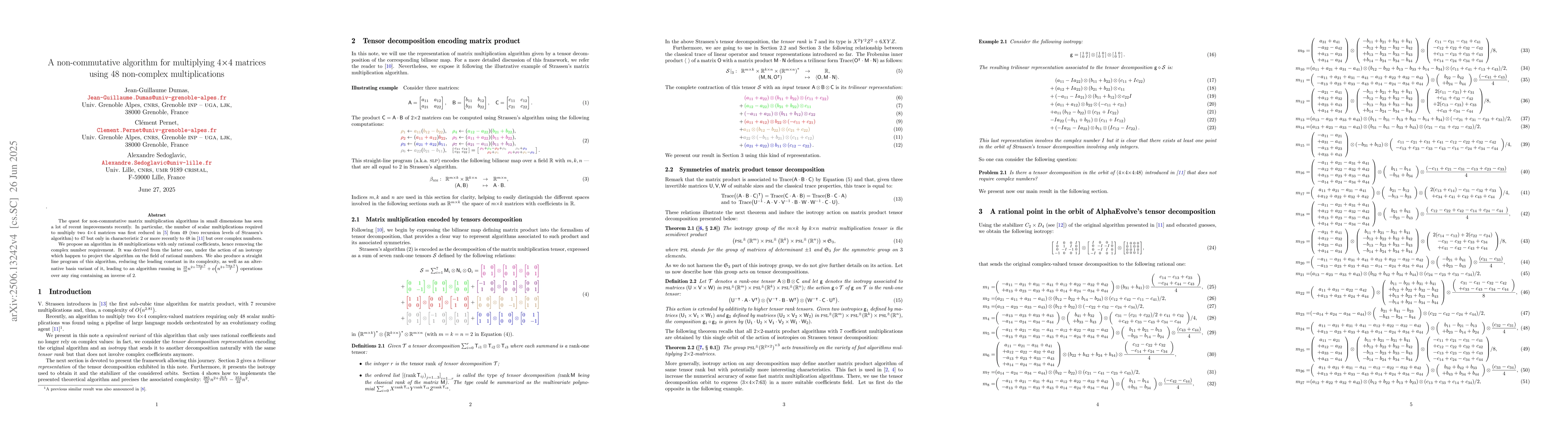 The quest for non-commutative matrix multiplication algorithms in small dimensions has seen a lot of recent improvements recently. In particular, the number of scalar multiplications required to multiply two $4\times4$ matrices was first reduced in \cite{Fawzi:2022aa} from 49 (two recursion levels of Strassen's algorithm) to 47 but only in characteristic 2 or more recently to 48 in \cite{alphaevolve} but over complex numbers. We propose an algorithm in 48 multiplications with only rational coefficients, hence removing the complex number requirement. It was derived from the latter one, under the action of an isotropy which happen to project the algorithm on the field of rational numbers. We also produce a straight line program of this algorithm, reducing the leading constant in the complexity, as well as an alternative basis variant of it, leading to an algorithm running in $\frac{19}{16} n^{2+\frac{\log_2 3}{2}} +o\left(n^{2+\frac{log_2 3}{2}}\right)$ operations over any ring containing an inverse of 2.