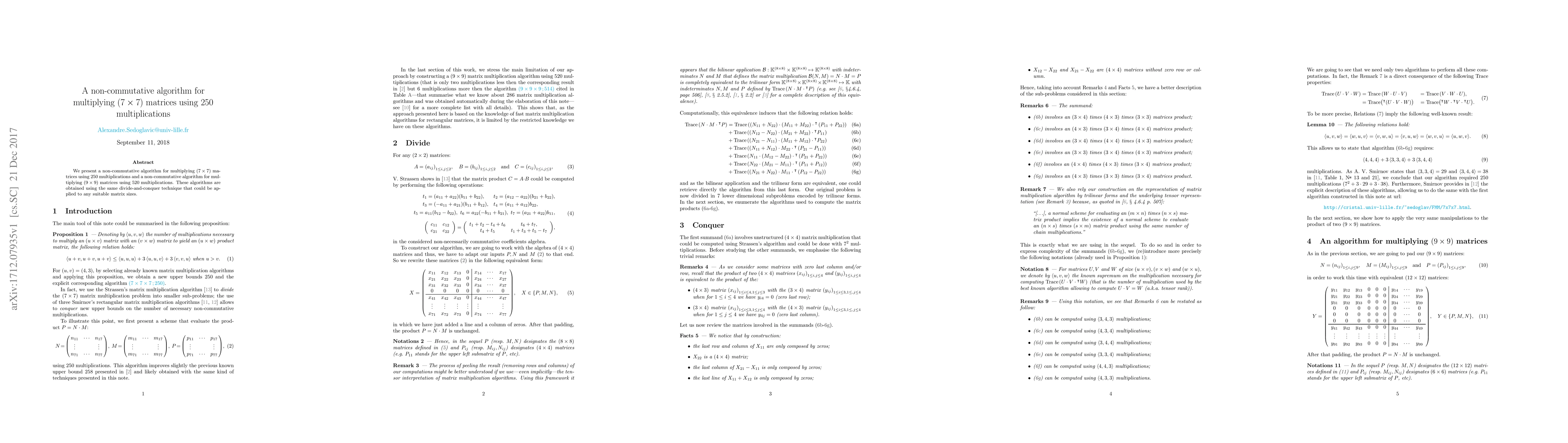We present a non-commutative algorithm for multiplying (7x7) matrices using 250 multiplications and a non-commutative algorithm for multiplying (9x9) matrices using 520 multiplications. These algorithms are obtained using the same divide-and-conquer technique.