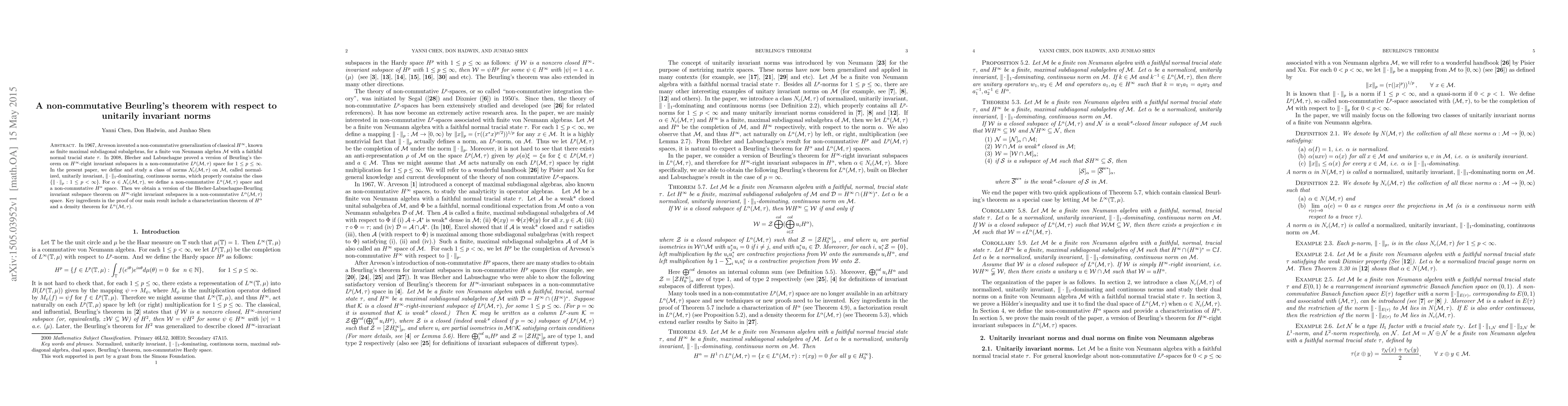 This paper generalizes Beurling's theorem to a non-commutative setting by defining a class of unitarily invariant norms on a von Neumann algebra. It establishes a version of the Beurling invariant subspace theorem for $H^\infty$-right invariant subspaces in a non-commutative $L^\alpha(\mathcal{M},\tau)$ space, using a characterization of $H^\alpha$ and density results for $L^\alpha(\mathcal{M},\tau)$.