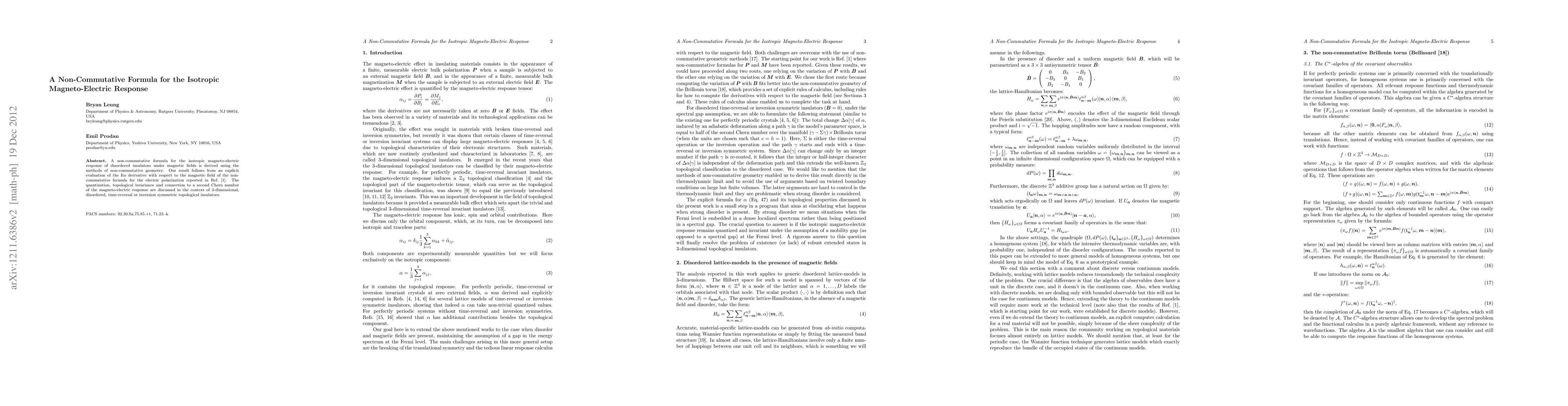This paper derives a non-commutative formula for the isotropic magneto-electric response in disordered insulators using non-commutative geometry, focusing on topological invariants and their relation to the second Chern number in 3D topological insulators. The study quantifies the response through an explicit evaluation of the Ito derivative of electric polarization.