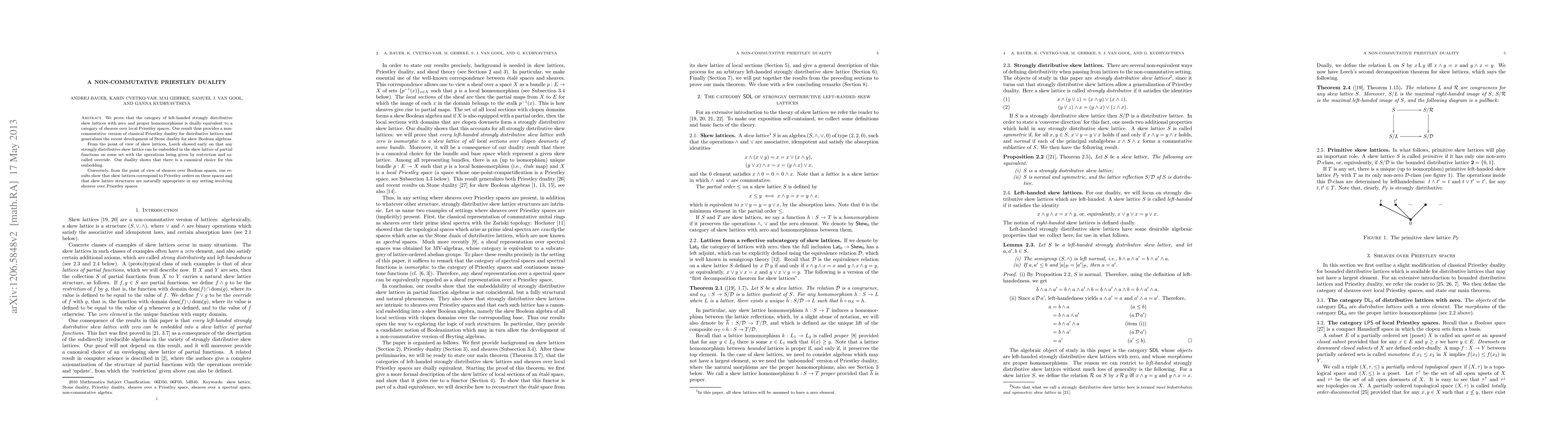 This paper establishes a non-commutative Priestley duality by showing a dual equivalence between left-handed strongly distributive skew lattices and sheaves over local Priestley spaces, generalizing classical Priestley duality and Stone duality for skew Boolean algebras. The duality reveals a canonical embedding of skew lattices into partial functions on sets.
