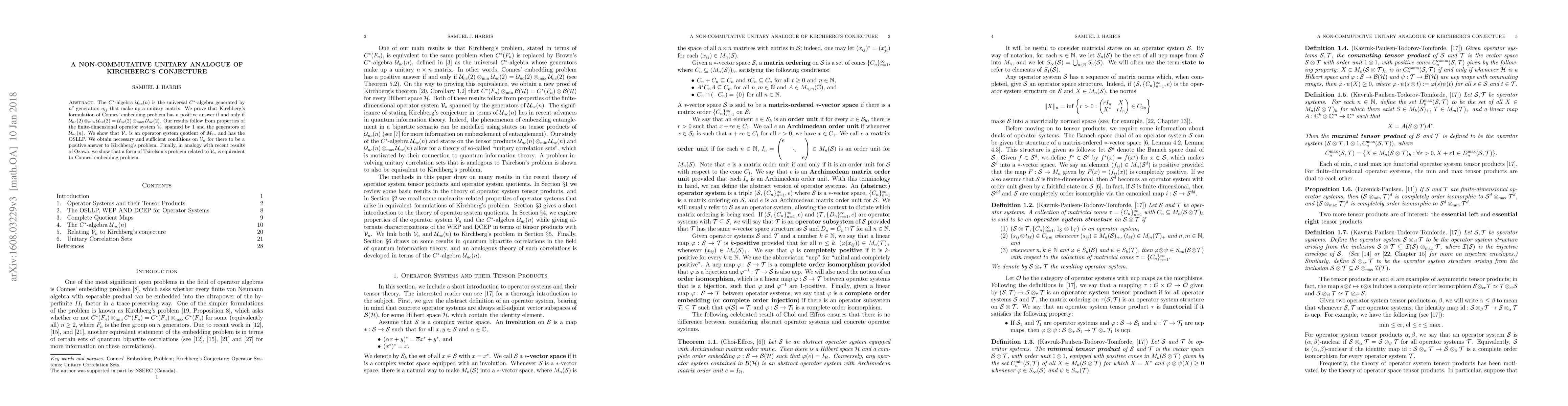 The $C^{\ast}$-algebra $\mathcal{U}_{nc}(n)$ is the universal $C^{\ast}$-algebra generated by $n^2$ generators $u_{ij}$ that make up a unitary matrix. We prove that Kirchberg's formulation of Connes' embedding problem has a positive answer if and only if $\mathcal{U}_{nc}(2) \otimes_{\min} \mathcal{U}_{nc}(2)=\mathcal{U}_{nc}(2) \otimes_{\max} \mathcal{U}_{nc}(2)$. Our results follow from properties of the finite-dimensional operator system $\mathcal{V}_n$ spanned by $1$ and the generators of $\mathcal{U}_{nc}(n)$. We show that $\mathcal{V}_n$ is an operator system quotient of $M_{2n}$ and has the OSLLP. We obtain necessary and sufficient conditions on $\mathcal{V}_n$ for there to be a positive answer to Kirchberg's problem. Finally, in analogy with recent results of Ozawa, we show that a form of Tsirelson's problem related to $\mathcal{V}_n$ is equivalent to Connes' Embedding problem.