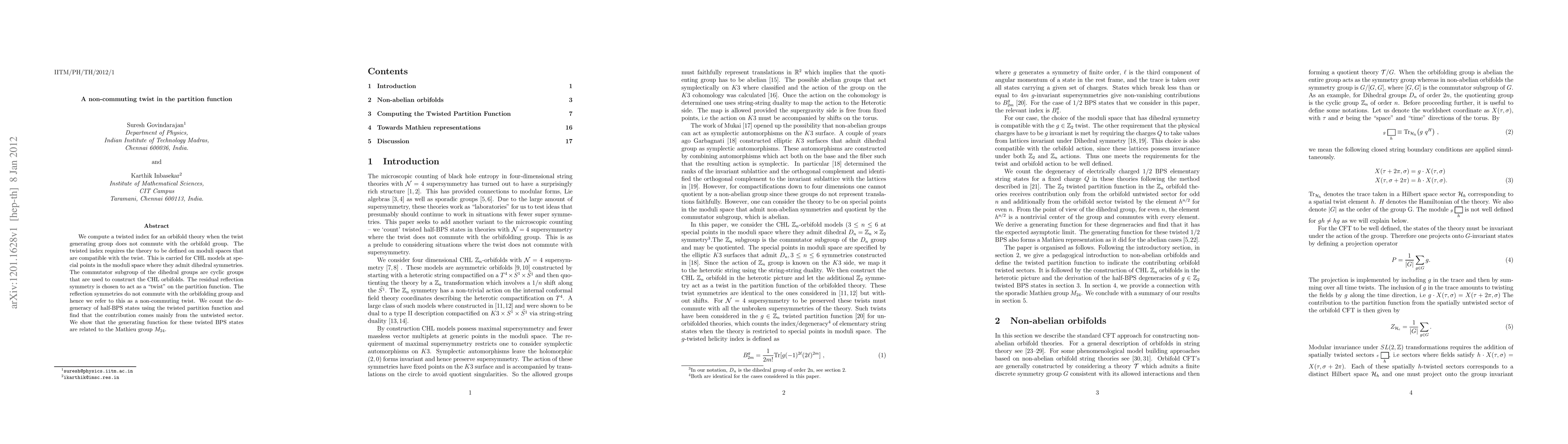 We compute a twisted index for an orbifold theory when the twist generating group does not commute with the orbifold group. The twisted index requires the theory to be defined on moduli spaces that are compatible with the twist. This is carried out for CHL models at special points in the moduli space where they admit dihedral symmetries. The commutator subgroup of the dihedral groups are cyclic groups that are used to construct the CHL orbifolds. The residual reflection symmetry is chosen to act as a `twist' on the partition function. The reflection symmetries do not commute with the orbifolding group and hence we refer to this as a non-commuting twist. We count the degeneracy of half-BPS states using the twisted partition function and find that the contribution comes mainly from the untwisted sector. We show that the generating function for these twisted BPS states are related to the Mathieu group M_{24}.