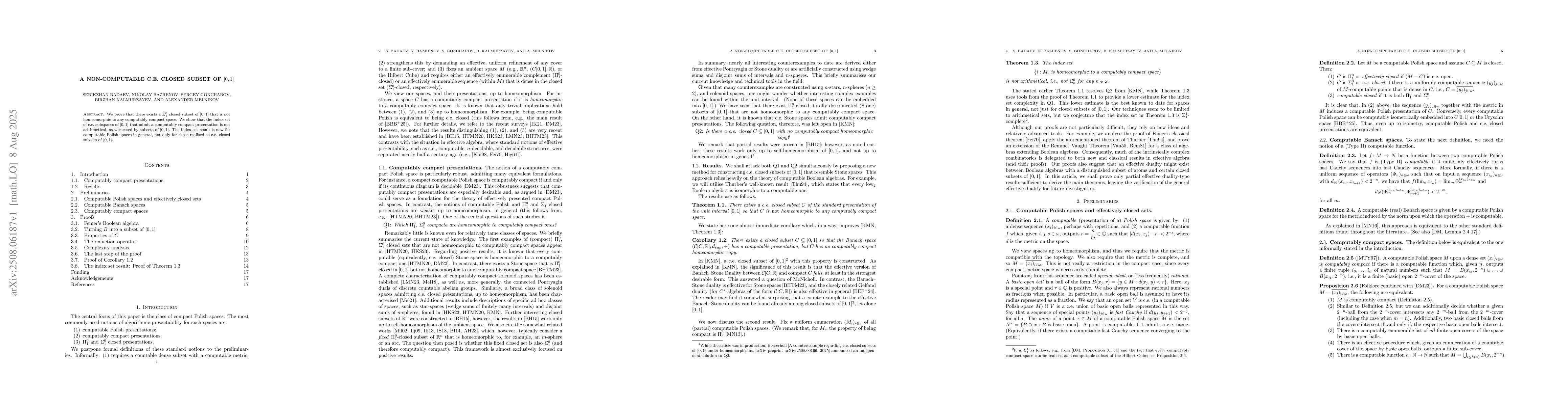 We prove that there exists a $\Sigma^0_1$ closed subset of $[0,1]$ that is not homeomorphic to any computably compact space. We show that the index set of c.e. subspaces of $[0,1]$ that admit a computably compact presentation is not arithmetical, as witnessed by subsets of $[0,1]$. The index set result is new for computable Polish spaces in general, not only for those realised as c.e. closed subsets of $[0,1]$.