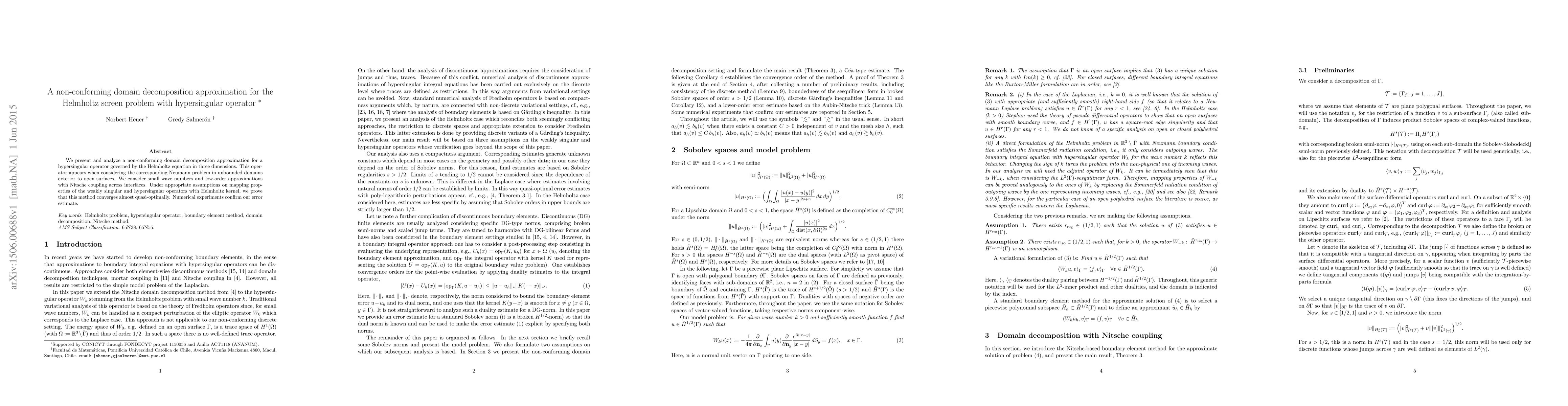 This paper proposes a non-conforming domain decomposition method for solving the Helmholtz screen problem with a hypersingular operator in three dimensions, demonstrating almost quasi-optimal convergence. Numerical experiments validate the theoretical error estimates.