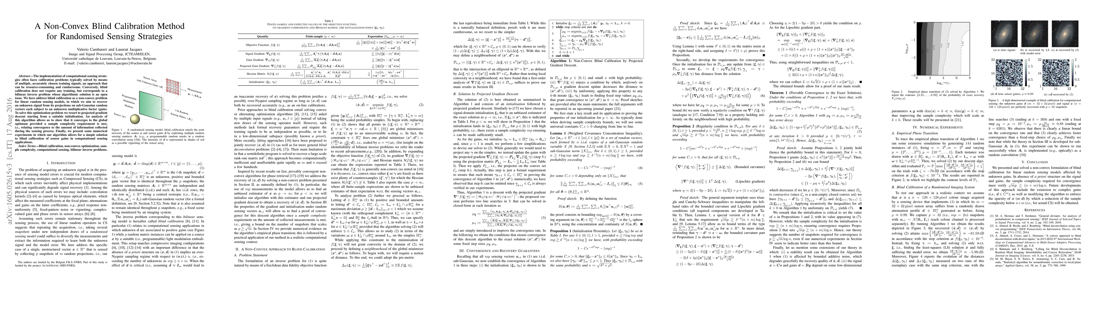 This paper proposes a non-convex blind calibration method for linear random sensing models, addressing the challenge of recovering an unknown signal without training signals. The authors use projected gradient descent to solve the bilinear inverse problem and demonstrate convergence to the global optimum under certain sample complexity conditions, validated through numerical experiments.
