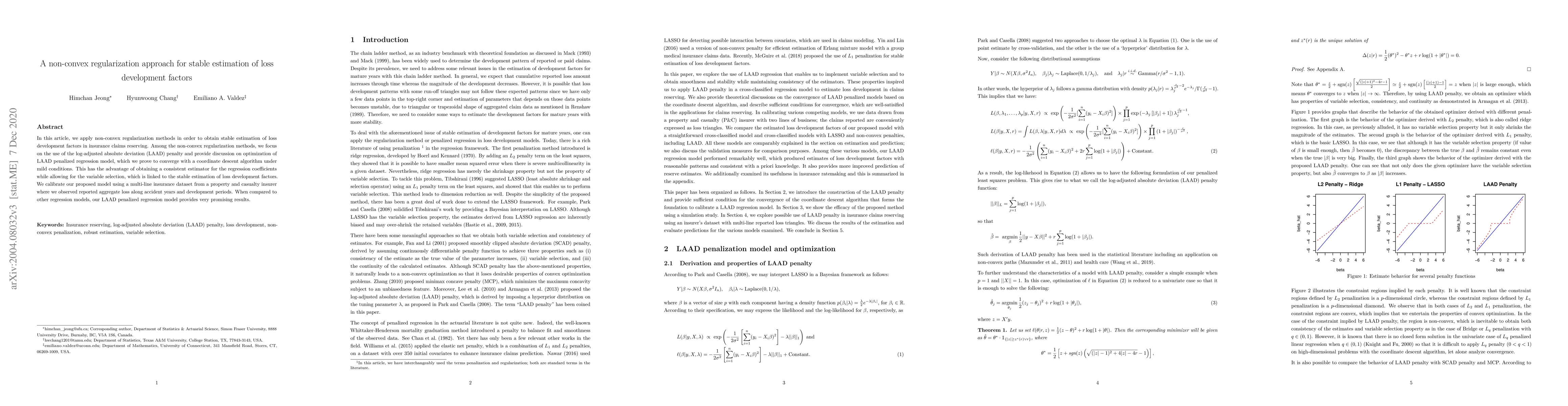 This paper proposes a non-convex regularization method using the log-adjusted absolute deviation (LAAD) penalty for stable estimation of loss development factors in insurance claims reserving. The LAAD penalized regression model, optimized via a coordinate descent algorithm, consistently estimates regression coefficients and facilitates variable selection.