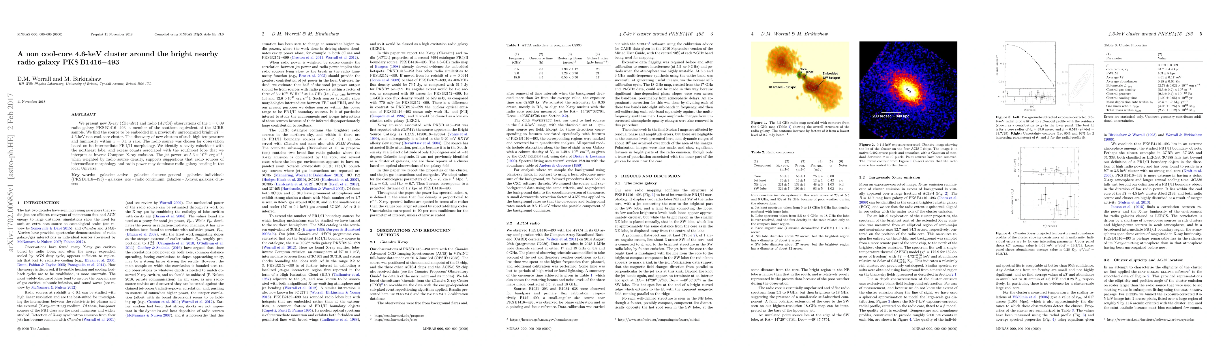 We present new X-ray (Chandra) and radio (ATCA) observations of the z=0.09 radio galaxy PKS B1416-493, a member of the southern equivalent of the 3CRR sample. We find the source to be embedded in a previously unrecognized bright kT=4.6 keV non cool-core cluster. The discovery of new clusters of such high temperature and luminosity within z=0.1 is rare. The radio source was chosen for observation based on its intermediate FRI/II morphology. We identify a cavity coincident with the northeast lobe, and excess counts associated with the southwest lobe that we interpret as inverse Compton X-ray emission. The jet power, at 5.3 x 10^44 erg/s, when weighted by radio source density, supports suggestions that radio sources of intermediate morphology and radio power may dominate radio-galaxy heating in the local Universe.