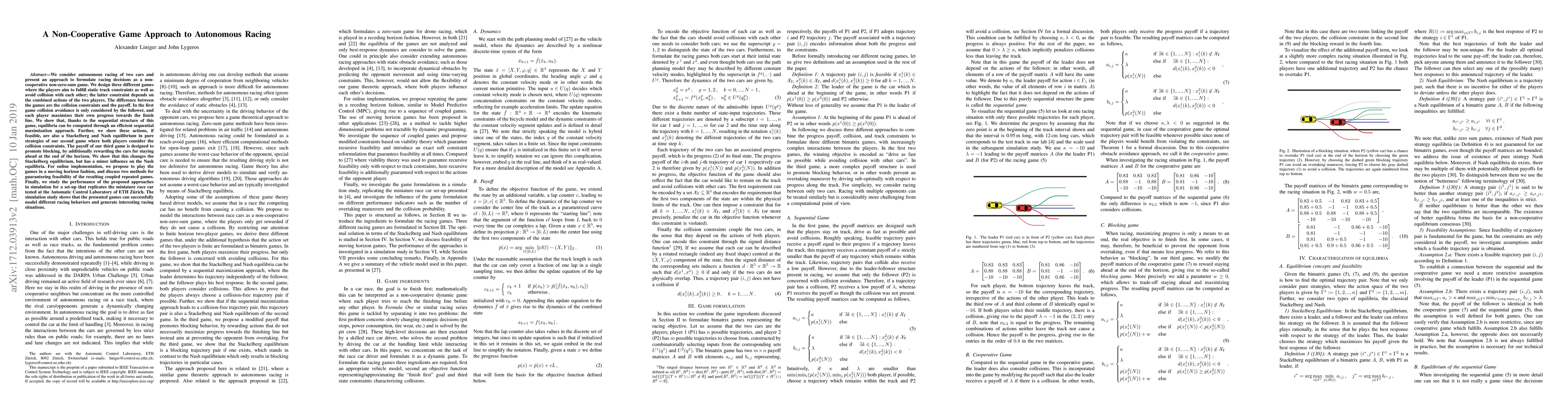 This paper formulates autonomous racing as a non-cooperative non-zero-sum game, exploring three game variants with varying collision and payoff structures. Simulation results demonstrate the effectiveness of the proposed game-theoretic approach in modeling diverse racing behaviors and generating dynamic racing scenarios.