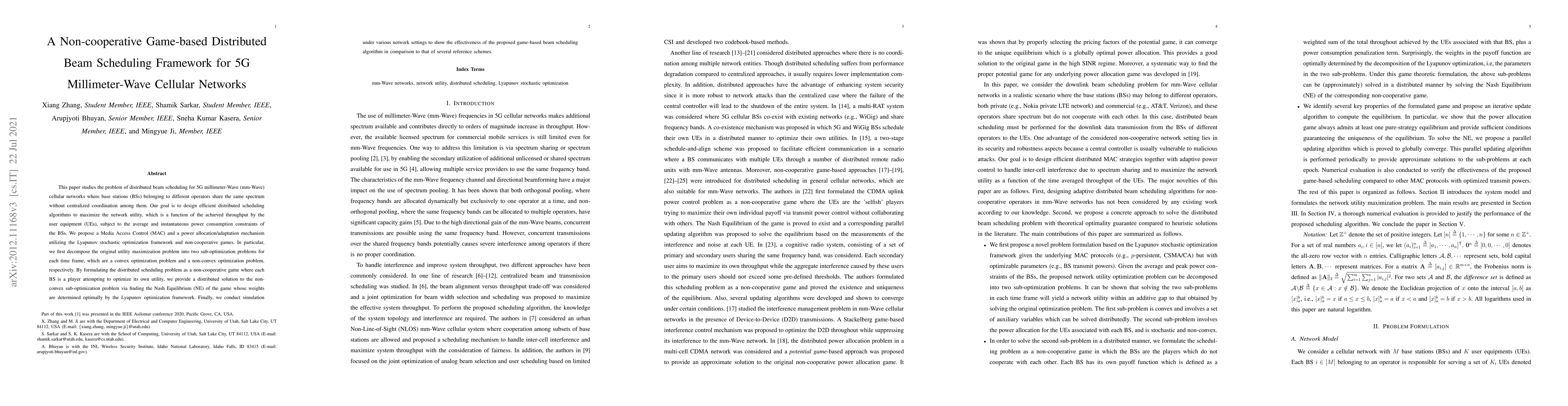 This paper proposes a non-cooperative game-based distributed beam scheduling framework for 5G millimeter-Wave cellular networks, aiming to maximize network utility through efficient distributed algorithms. The approach leverages Lyapunov stochastic optimization and non-cooperative games to solve a decomposed utility maximization problem, achieving Nash Equilibrium for optimal power allocation.