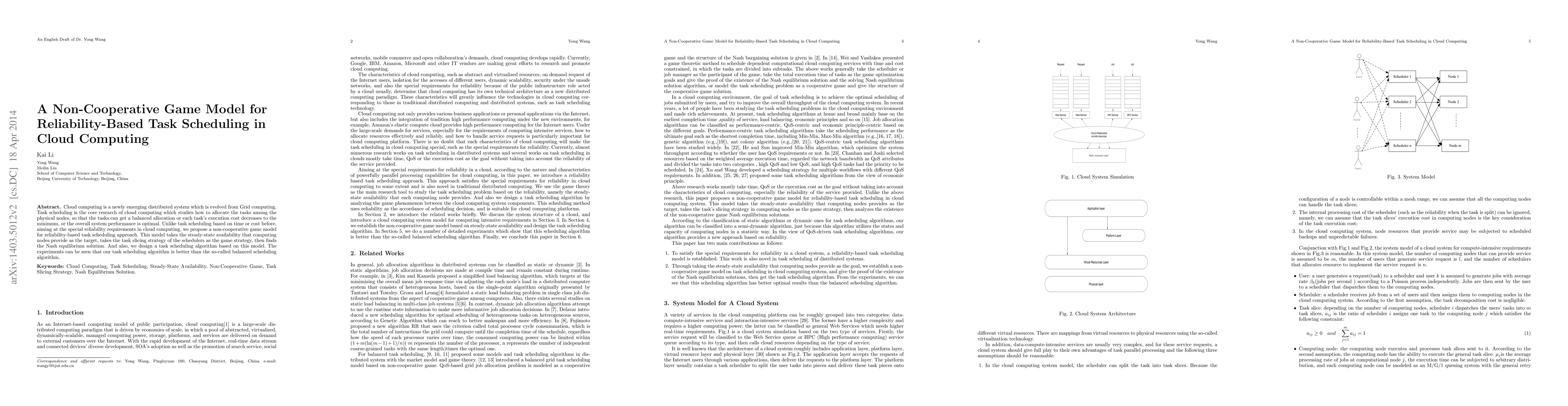 This paper proposes a non-cooperative game model for reliability-based task scheduling in cloud computing, focusing on steady-state availability and task slicing strategies. The model finds Nash equilibrium solutions and outperforms traditional balanced scheduling algorithms in experiments.