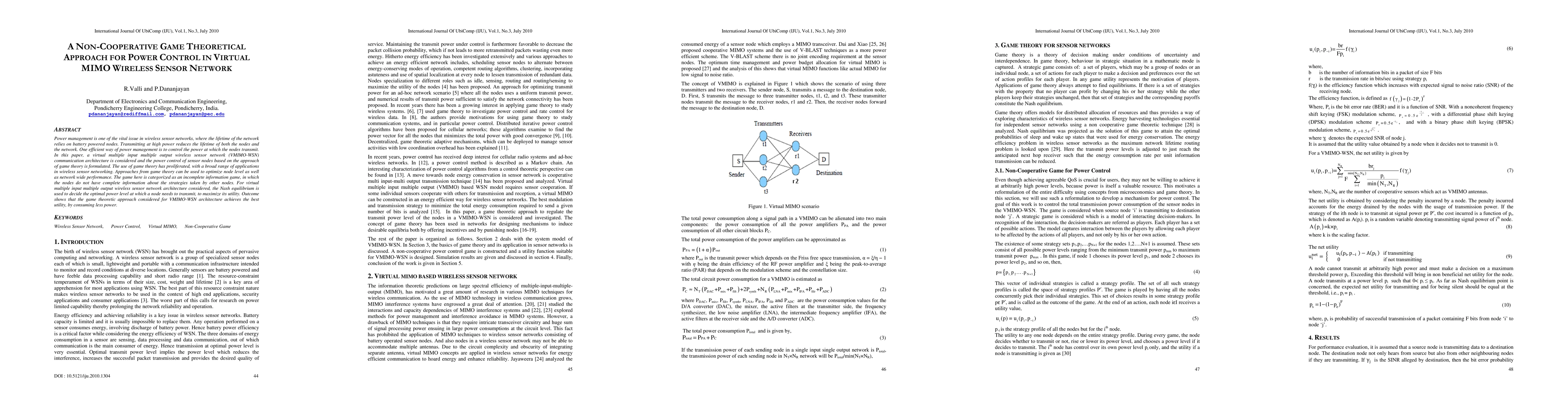 This paper proposes a non-cooperative game theoretical approach for power control in a virtual MIMO wireless sensor network, using Nash equilibrium to determine optimal transmission power levels, thereby maximizing utility and minimizing power consumption. The method is shown to enhance network performance and extend the network's lifetime.