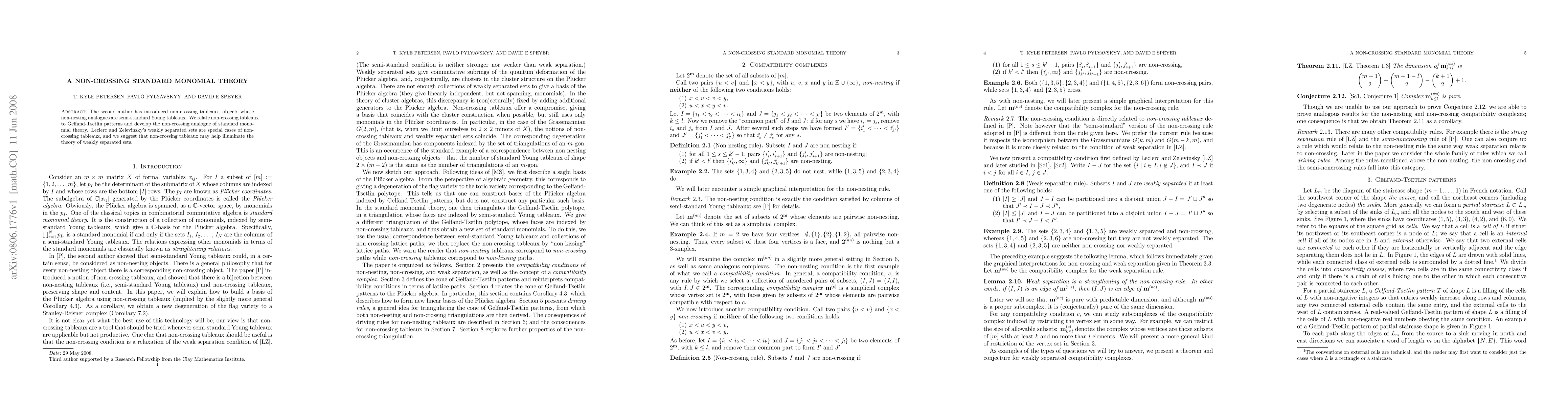 The second author has introduced non-crossing tableaux, objects whose non-nesting analogues are semi-standard Young tableaux. We relate non-crossing tableaux to Gelfand-Tsetlin patterns and develop the non-crossing analogue of standard monomial theory. Leclerc and Zelevinsky's weakly separated sets are special cases of non-crossing tableaux, and we suggest that non-crossing tableaux may help illuminate the theory of weakly separated sets.