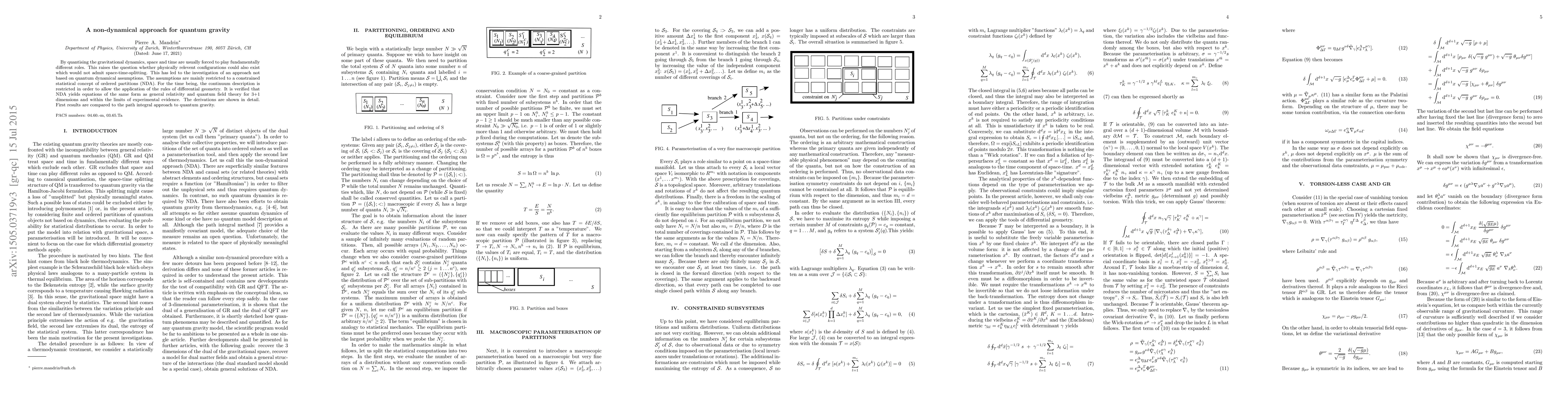 By quantising the gravitational dynamics, space and time are usually forced to play fundamentally different roles. This raises the question whether physically relevent configurations could also exist which would not admit space-time-splitting. This has led to the investigation of an approach not based on quantum dynamical assumptions. The assumptions are mainly restricted to a constrained statistical concept of ordered partitions (NDA). For the time being, the continuum description is restricted in order to allow the application of the rules of differential geometry. It is verified that NDA yields equations of the same form as general relativity and quantum field theory for 3+1 dimensions and within the limits of experimental evidence. The derivations are shown in detail. First results are compared to the path integral approach to quantum gravity.