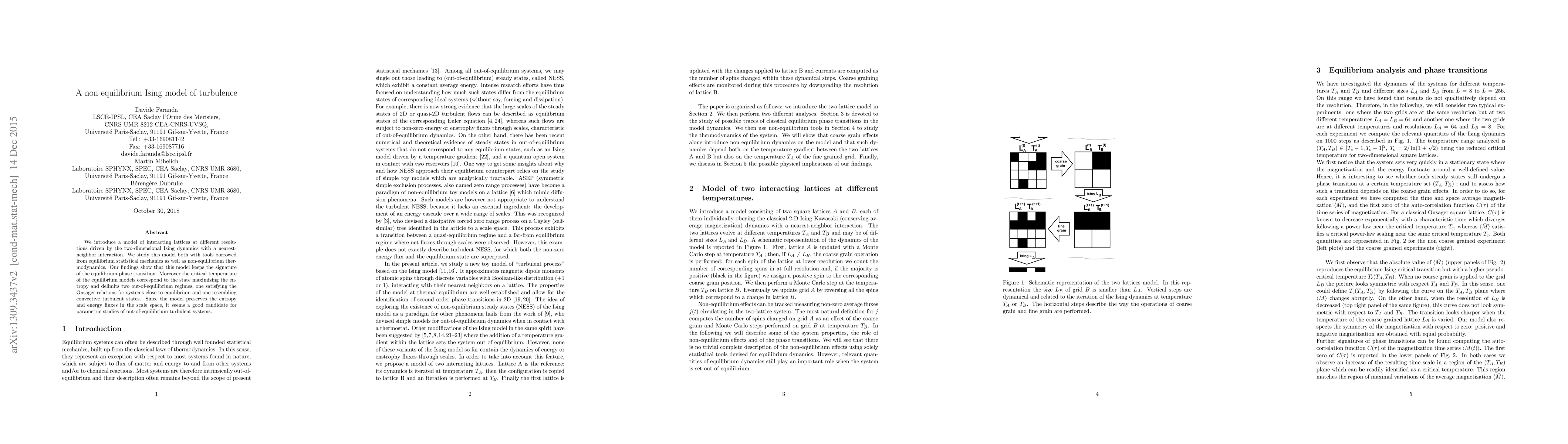 This paper proposes a non-equilibrium Ising model of interacting lattices to study turbulence, showing that it retains the signature of equilibrium phase transitions and identifies two distinct out-of-equilibrium regimes, one near equilibrium and one resembling turbulent states. The model's critical temperature corresponds to maximum entropy and could serve as a basis for further studies on turbulent systems.