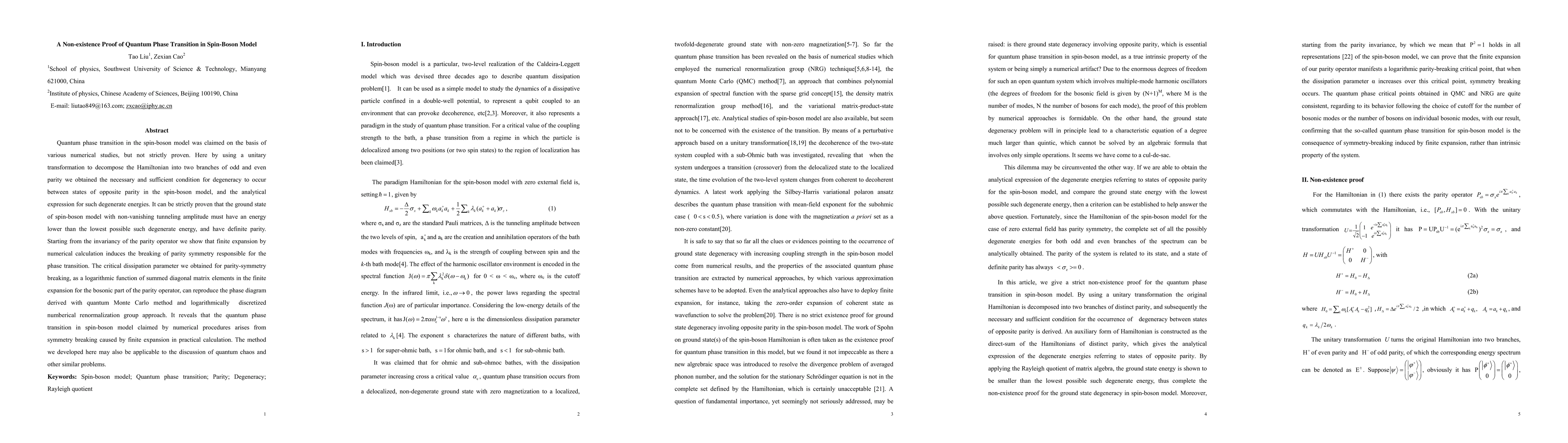 Quantum phase transition in the spin-boson model was claimed on the basis of various numerical studies, but not strictly proven. Here by using a unitary transformation to decompose the Hamiltonian into two branches of odd and even parity we obtained the necessary and sufficient condition for degeneracy to occur between states of opposite parity in the spin-boson model, and the analytical expression for such degenerate energies. It can be strictly proven that the ground state of spin-boson model with non-vanishing tunneling amplitude must have an energy lower than the lowest possible such degenerate energy, and have definite parity. Starting from the invariancy of the parity operator we show that finite expansion by numerical calculation induces the breaking of parity symmetry responsible for the phase transition. The critical dissipation parameter we obtained for parity-symmetry breaking, as a logarithmic function of summed diagonal matrix elements in the finite expansion for the bosonic part of the parity operator, can reproduce the phase diagram derived with quantum Monte Carlo method and logarithmically discretized numberical renormalization group approach. It reveals that the quantum phase transition in spin-boson model claimed by numerical procedures arises from symmetry breaking caused by finite expansion in practical calculation. The method we developed here may also be applicable to the discussion of quantum chaos and other similar problems.