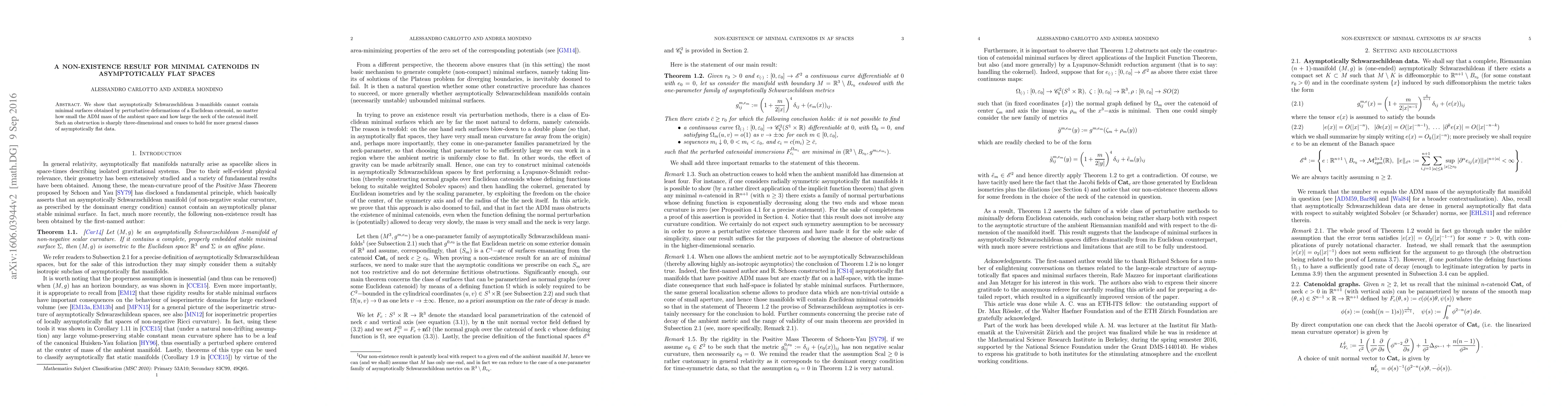 We show that asymptotically Schwarzschildean 3-manifolds cannot contain minimal surfaces obtained by perturbative deformations of a Euclidean catenoid, no matter how small the ADM mass of the ambient space and how large the neck of the catenoid itself. Such an obstruction is sharply three-dimensional and ceases to hold for more general classes of asymptotically flat data.