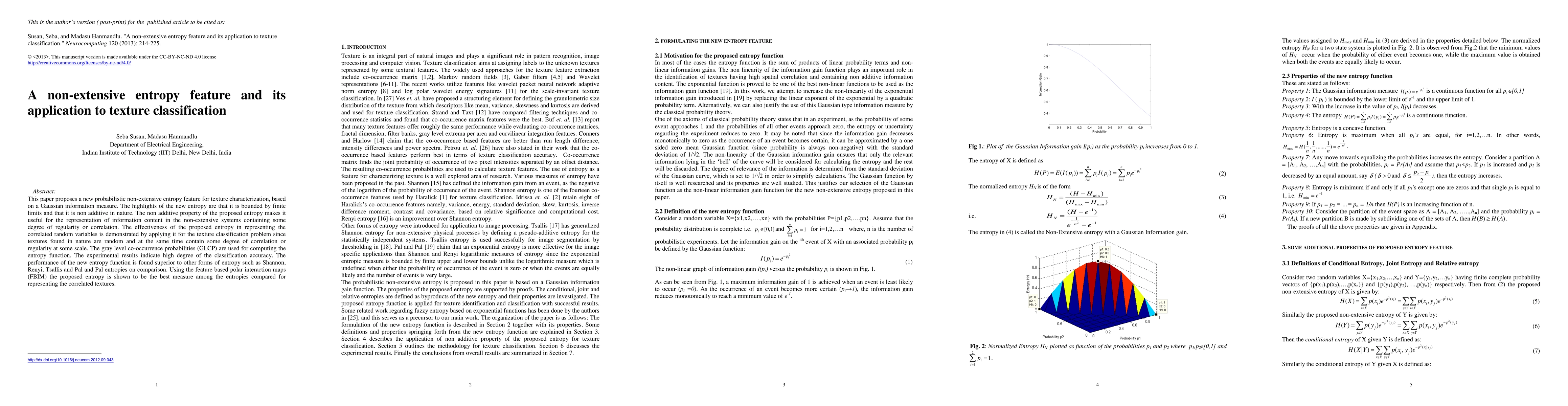 This paper proposes a new probabilistic non-extensive entropy feature for texture characterization, based on a Gaussian information measure. The highlights of the new entropy are that it is bounded by finite limits and that it is non additive in nature. The non additive property of the proposed entropy makes it useful for the representation of information content in the non-extensive systems containing some degree of regularity or correlation. The effectiveness of the proposed entropy in representing the correlated random variables is demonstrated by applying it for the texture classification problem since textures found in nature are random and at the same time contain some degree of correlation or regularity at some scale. The gray level co-occurrence probabilities (GLCP) are used for computing the entropy function. The experimental results indicate high degree of the classification accuracy. The performance of the new entropy function is found superior to other forms of entropy such as Shannon, Renyi, Tsallis and Pal and Pal entropies on comparison. Using the feature based polar interaction maps (FBIM) the proposed entropy is shown to be the best measure among the entropies compared for representing the correlated textures.