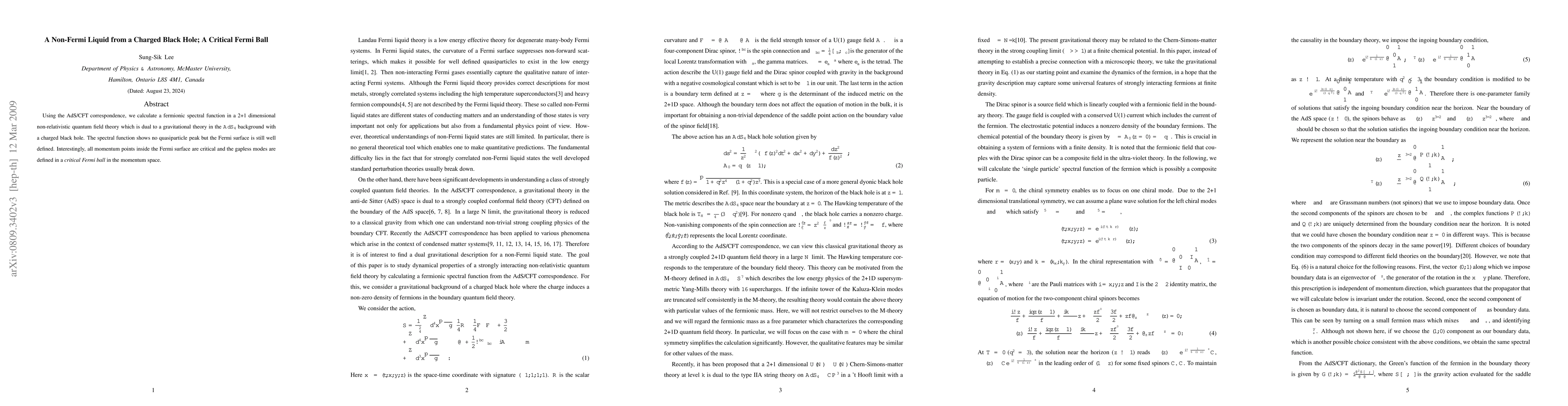 Using the AdS/CFT correspondence, we calculate a fermionic spectral function in a 2+1 dimensional non-relativistic quantum field theory which is dual to a gravitational theory in the $AdS_4$ background with a charged black hole. The spectral function shows no quasiparticle peak but the Fermi surface is still well defined. Interestingly, all momentum points inside the Fermi surface are critical and the gapless modes are defined in a {\it critical Fermi ball} in the momentum space.