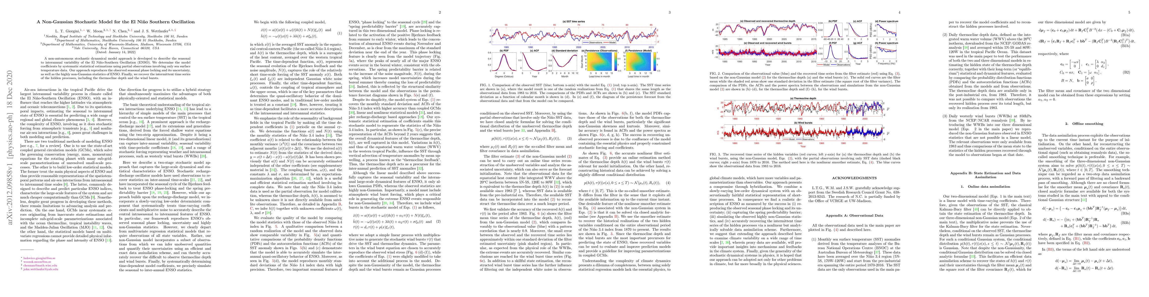 This paper develops a non-Gaussian stochastic model to capture the variability of the El Niño-Southern Oscillation (ENSO), estimating model coefficients from sea surface temperature data. The model successfully reproduces observed seasonal patterns and non-Gaussian statistics, and reveals hidden processes like thermocline depth and wind bursts.