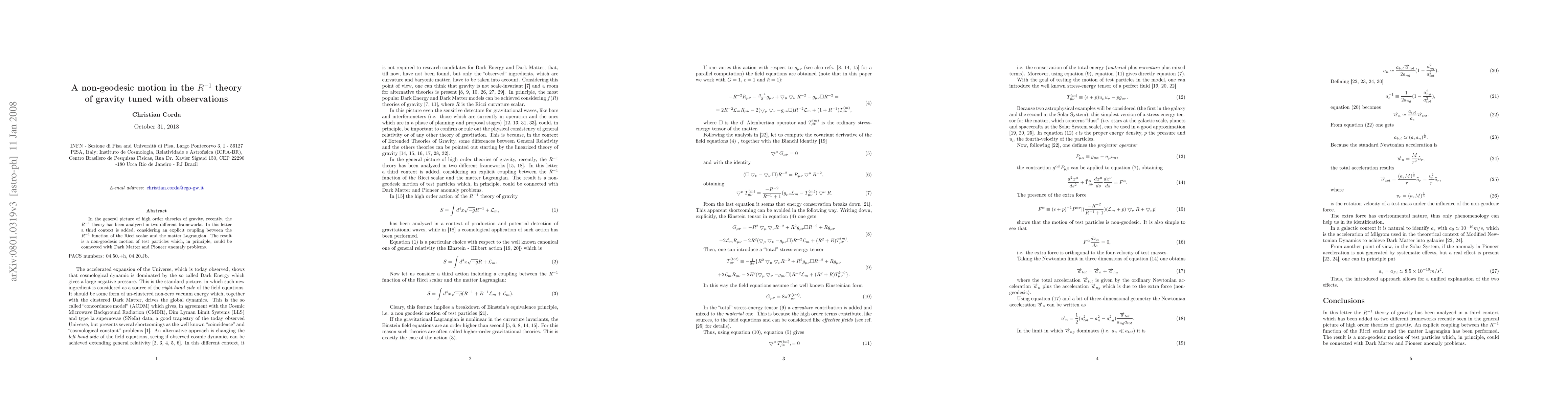 In the general picture of high order theories of gravity, recently, the R^-1 theory has been analyzed in two different frameworks. In this letter a third context is added, considering an explicit coupling between the R^-1 function of the Ricci scalar and the matter Lagrangian. The result is a non-geodesic motion of test particles which, in principle, could be connected with Dark Matter and Pioneer anomaly problems.