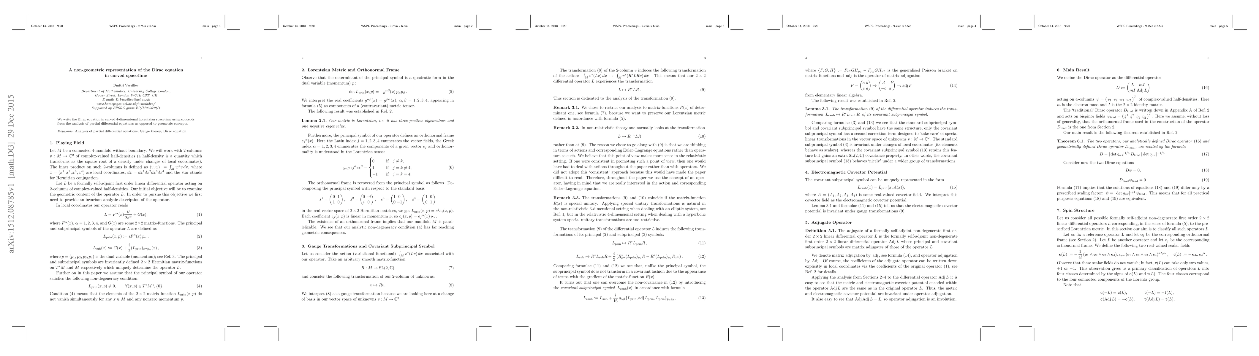 We write the Dirac equation in curved 4-dimensional Lorentzian spacetime using concepts from the analysis of partial differential equations as opposed to geometric concepts.